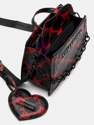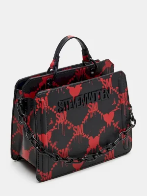 Clever interior organization and a matching pouch give the compact EVELYN BAG DRIPPY HEARTS BLACK/RED surprisingly roomy storage. Reinforced edges, structured side gussets, and custom hardware add to the substantial look and feel of this top-handle design.