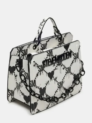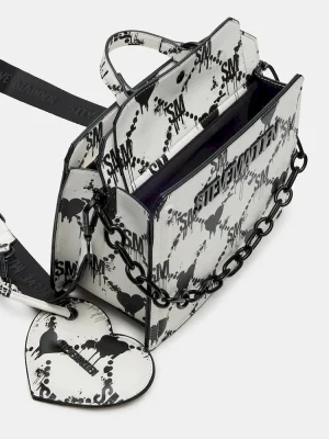 Clever interior organization and a matching pouch give the compact EVELYN BAG DRIPPY HEARTS WHITE/MULTI surprisingly roomy storage. Reinforced edges, structured side gussets, and custom hardware add to the substantial look and feel of this top-handle design.