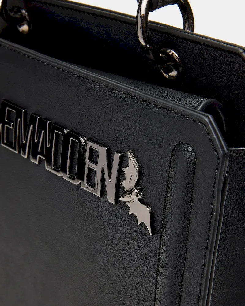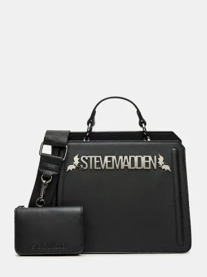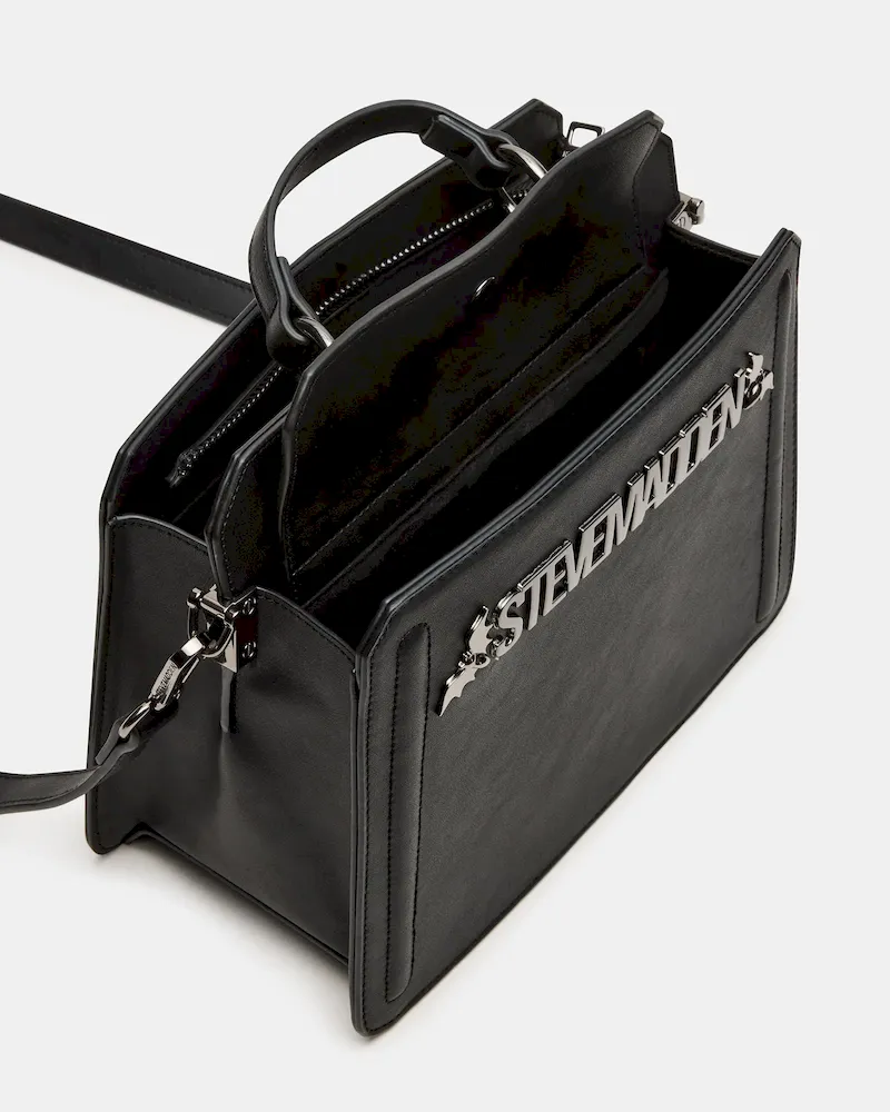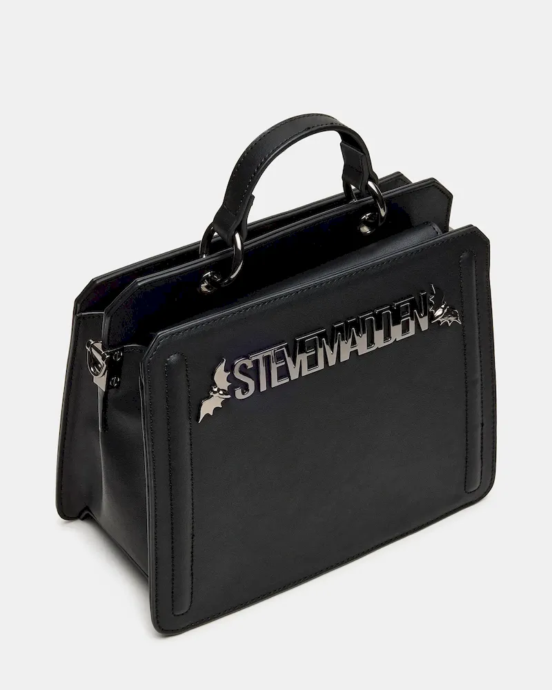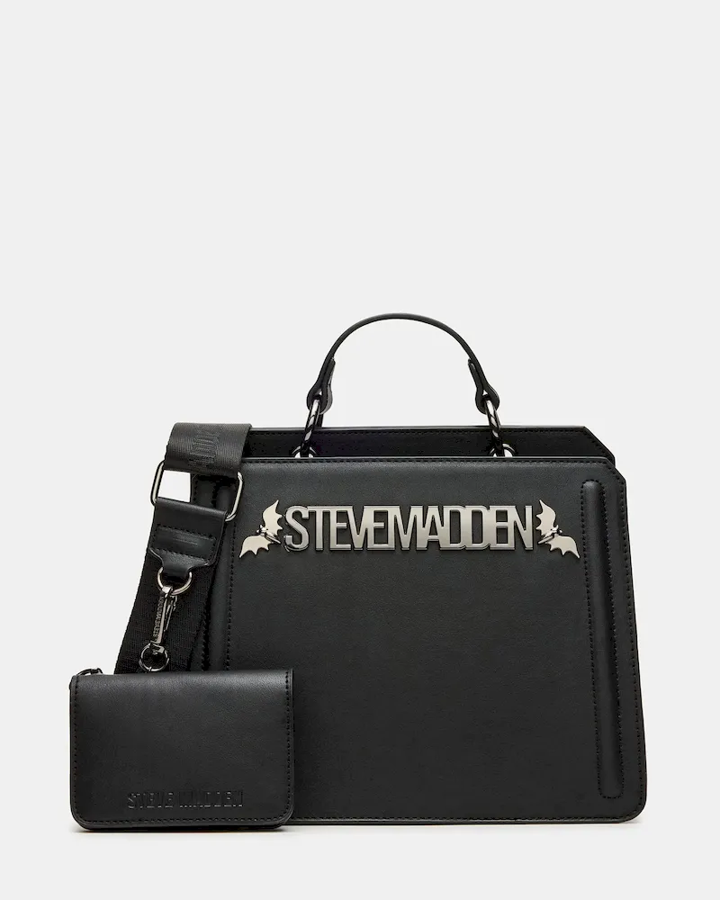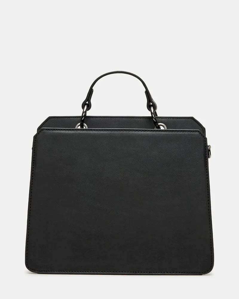 Clever interior organization and a matching modular zip pouch give the compact EVELYN BAT BAG BLACK surprisingly roomy storage. Reinforced edges, structured side gussets, and custom hardware add to the substantial look and feel of this top-handle design.
