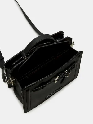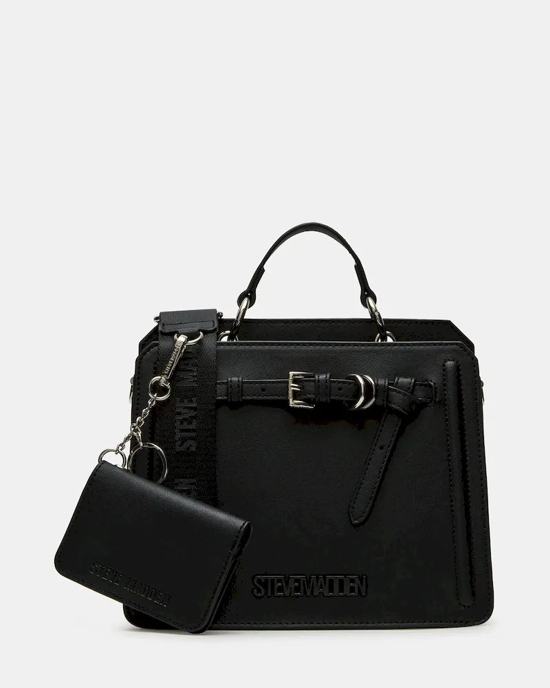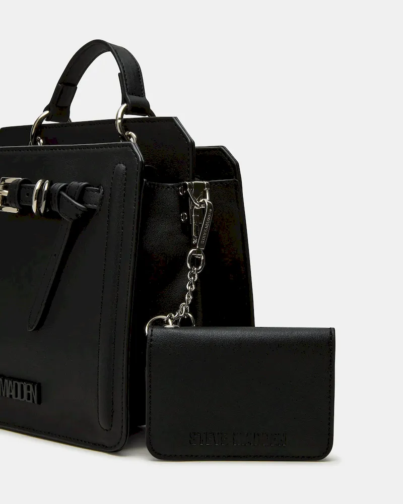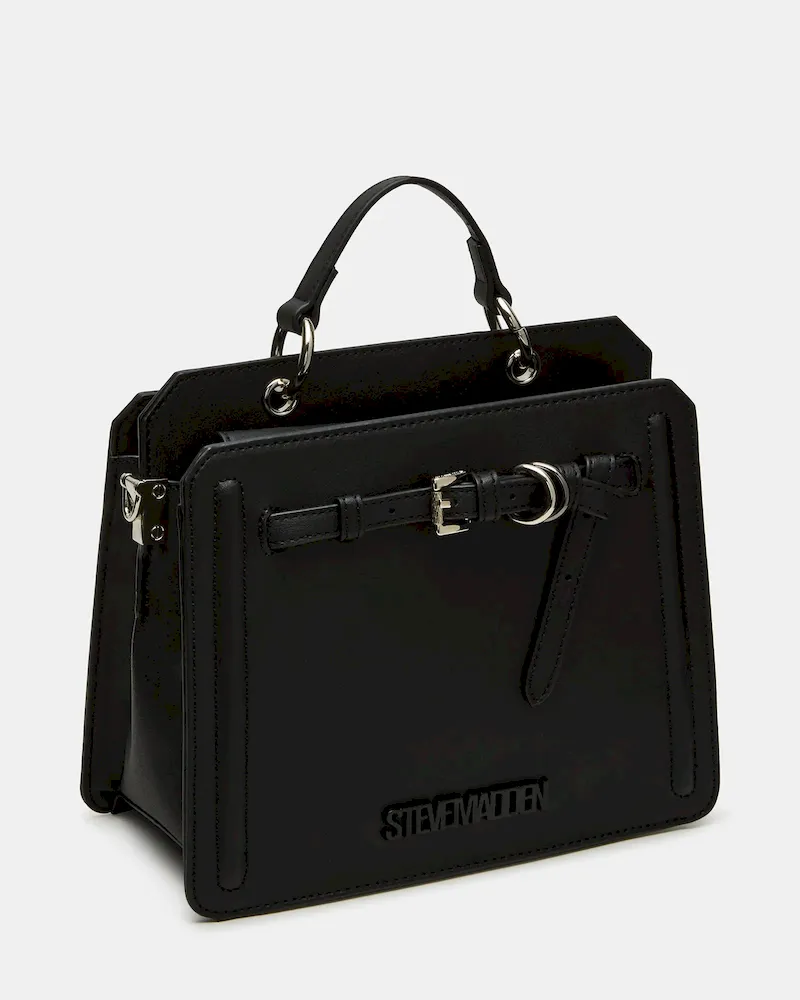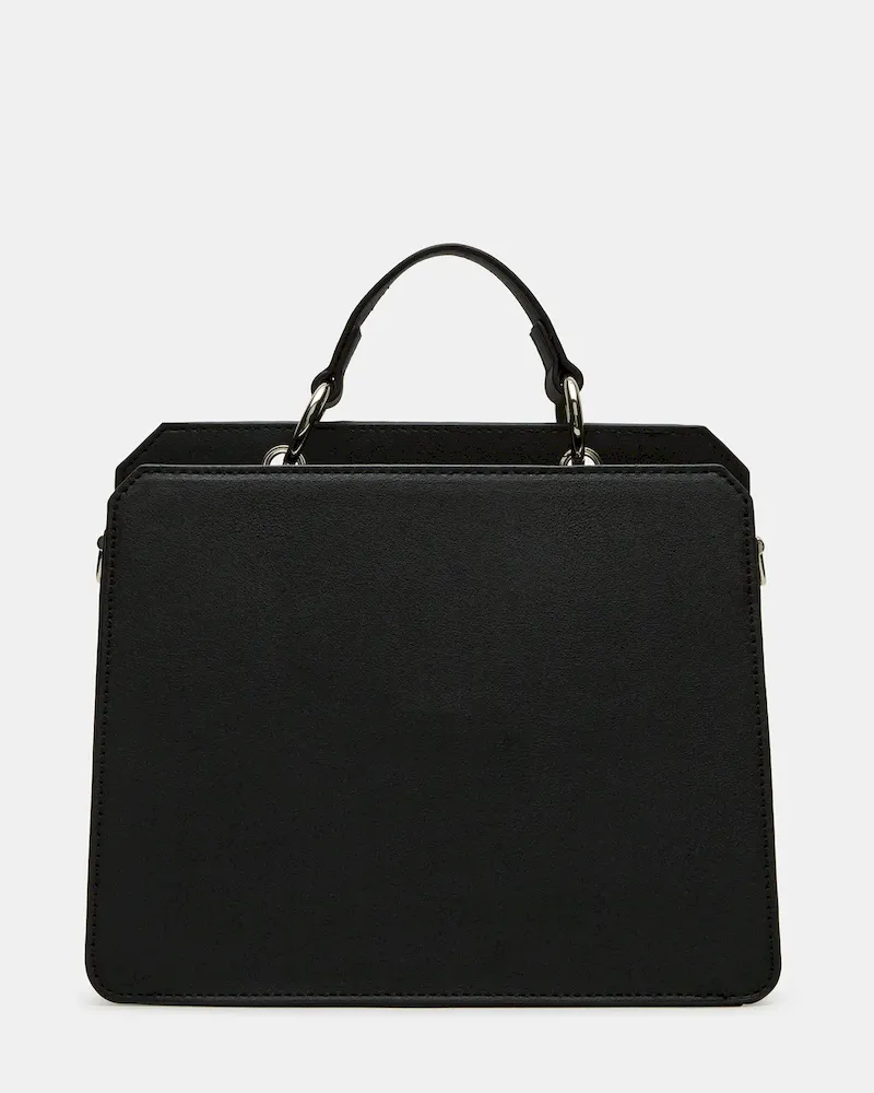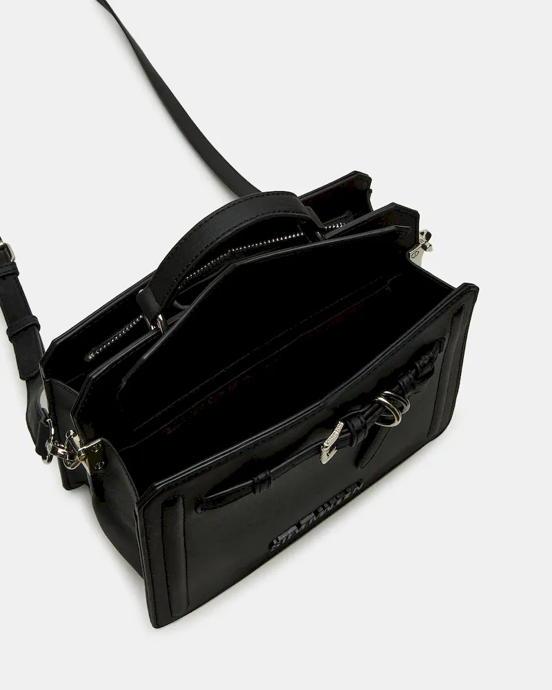 Clever interior organization and a matching pouch give the compact EVELYN BELT BAG BLACK surprisingly roomy storage. Reinforced edges, structured side gussets, and custom hardware add to the substantial look and feel of this top-handle design.
