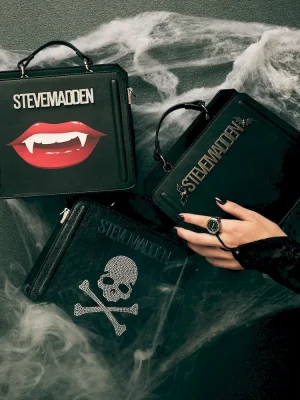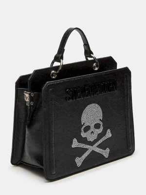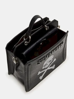 Clever interior organization and a matching modular zip pouch give the compact EVELYN skull bag surprisingly roomy storage. Reinforced edges, structured side gussets, and custom hardware add to the substantial look and feel of this top-handle design.