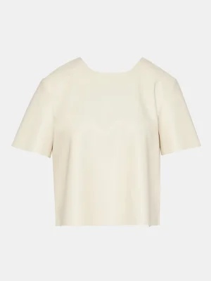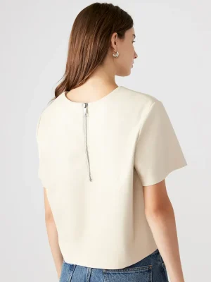 Introducing our luxurious EZRA top. Elevate your style with this short-sleeved faux leather T-shirt. The metal zipper closure adds a touch of sophistication to this chic piece. Make a statement with this exclusive and elegant top.
