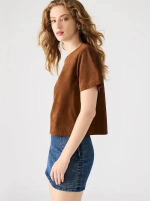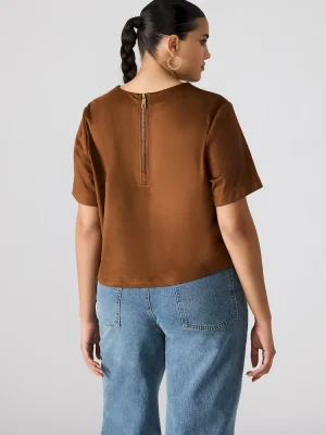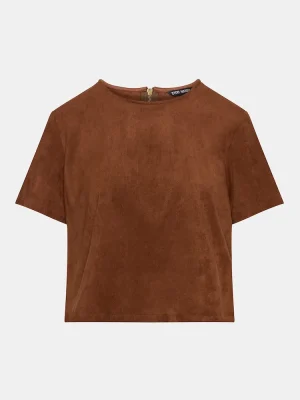 This EZRA faux-suede short-sleeved top features a sleek zip-up design at the back, combining modern style with easy wearability. Its soft texture and tailored fit make it a versatile piece for sophisticated casual looks. Ideal for layering or wearing alone, it offers both comfort and a polished finish.