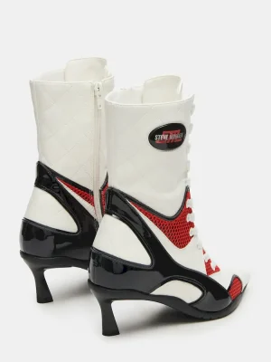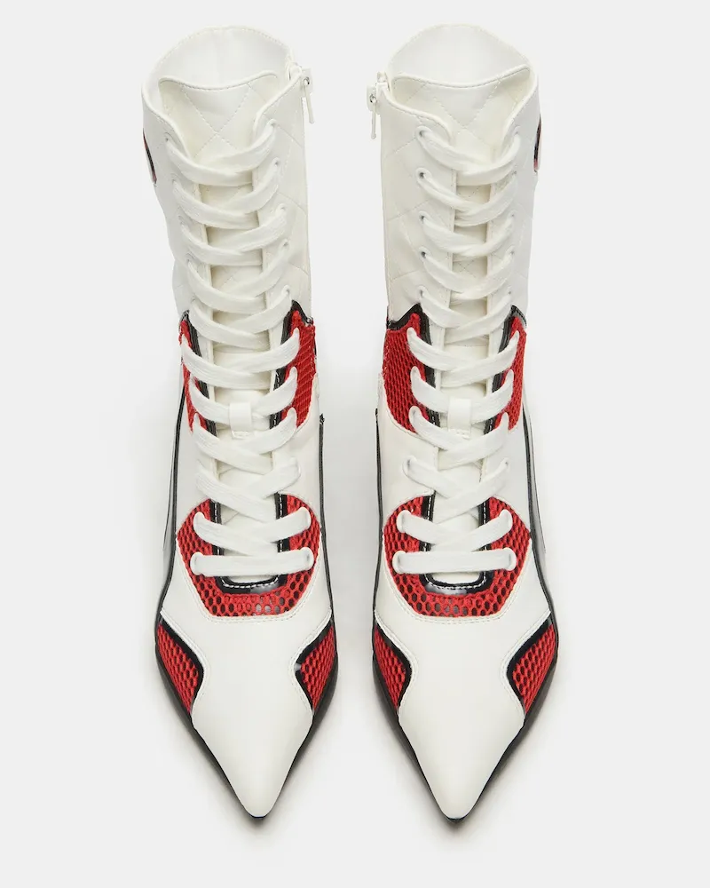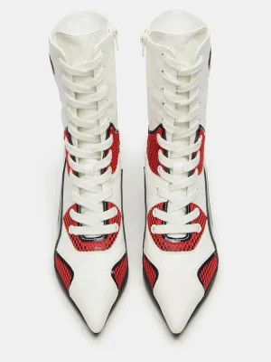 Elevate your footwear collection with the FANGIO, a sophisticated lace-up ankle bootie featuring a sleek pointed-toe and comfortable kitten heel. The striking color combination offers versatile styling options while maintaining a professional silhouette. Perfect for transitioning from office to evening with effortless elegance.