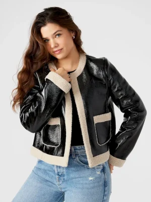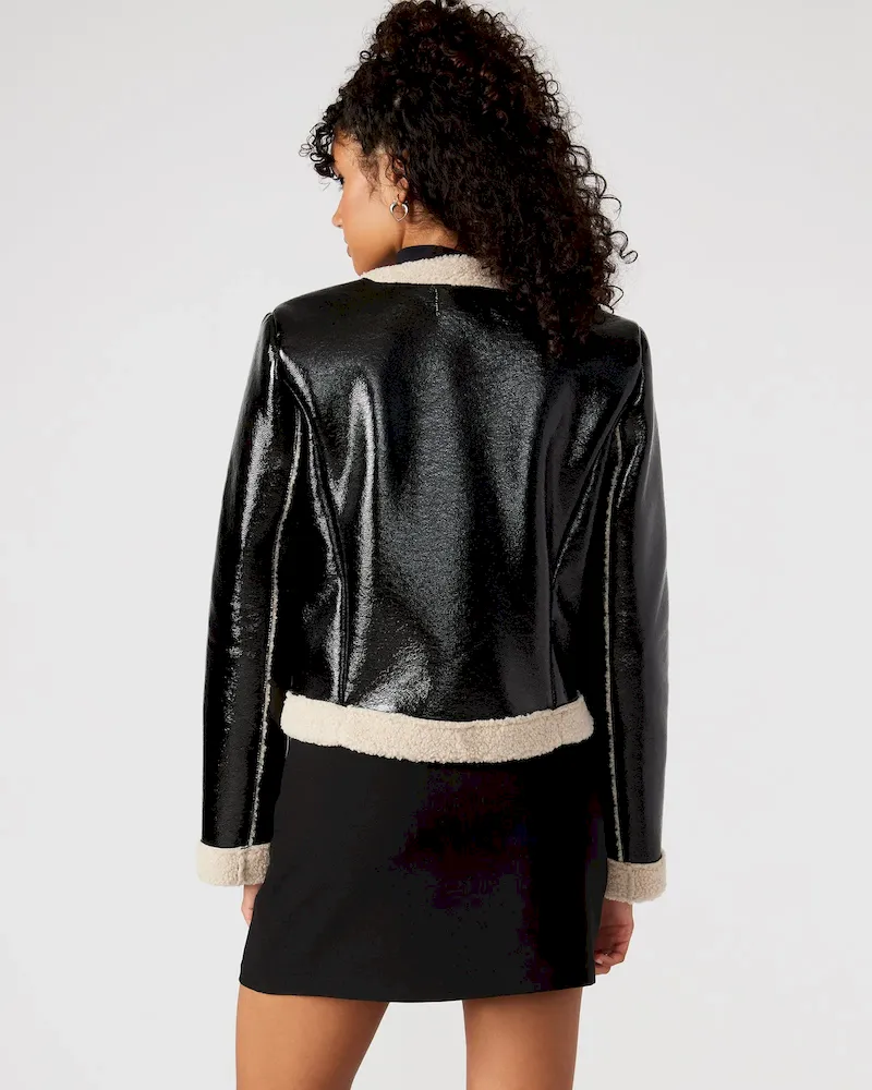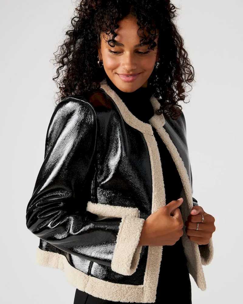 Stay warm and stylish with our FIENNE faux leather sherpa collarless open jacket. Its functional pockets make it a practical choice, while the luxurious materials and cozy shearling bonding elevate any outfit. Perfect for any occasion.