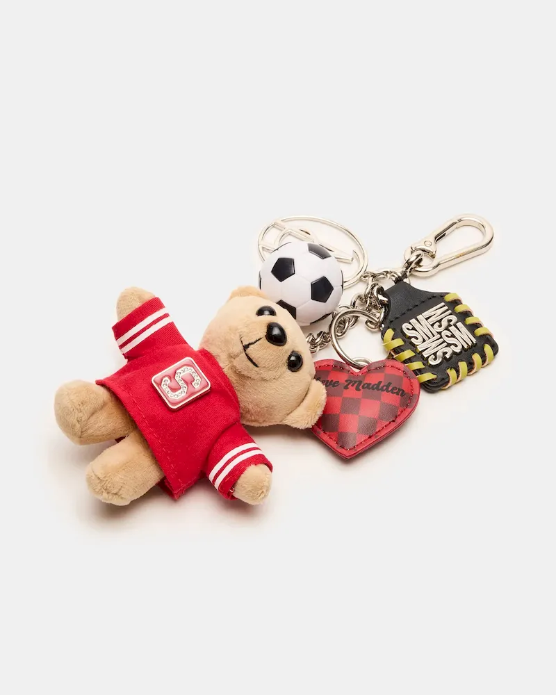Add a playful touch to your bag with our attachable GOAL BAG CHARM. This charming accessory features a stuffed bear with a soccer ball charm, accompanied by a metal logo and puff checkered heart charm. The dog clip attachment ensures secure placement.