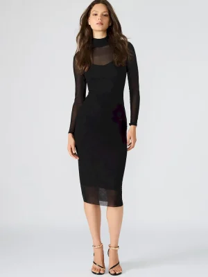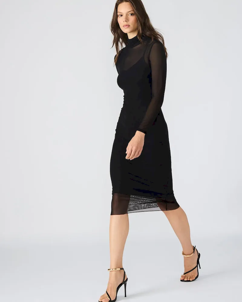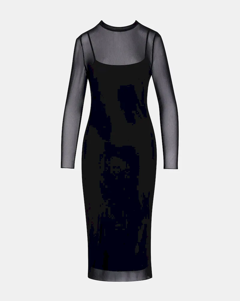 The HAILEE dress is a sophisticated midi-length piece crafted from sheer mesh fabric, featuring long sleeves and a refined mock neck. Its design balances elegance with modern edge, making it ideal for stylish evening events or upscale gatherings. The breathable mesh ensures comfort while maintaining a sleek silhouette, offering a confident and polished look.