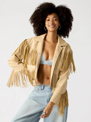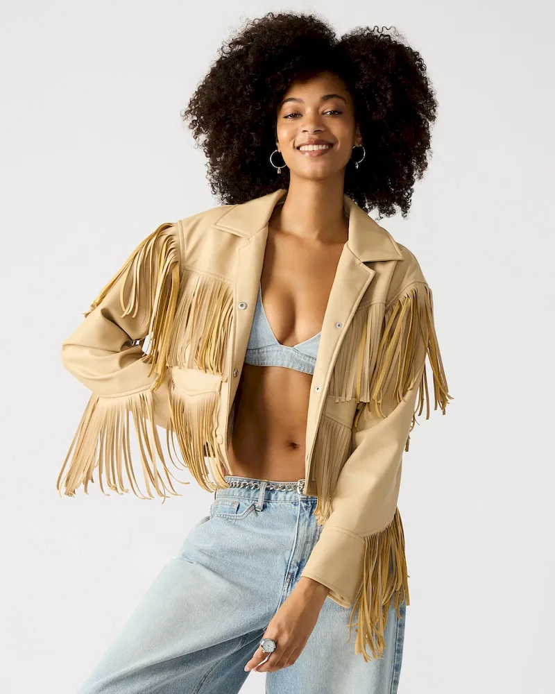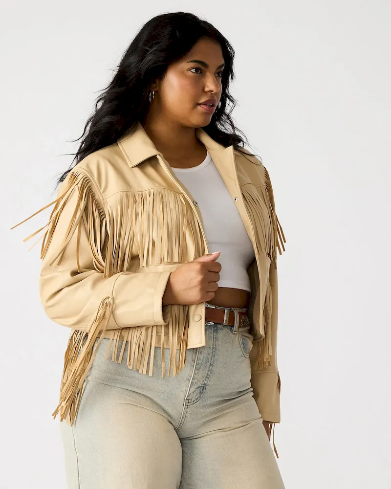 This expertly designed HALIA faux leather jacket combines the classic sophistication of a collared jacket with the trendy appeal of fringe detailing. Its snap button closure adds convenience to style, while its Western-inspired design adds a touch of adventure. Stay fashionable with this unique and versatile piece.