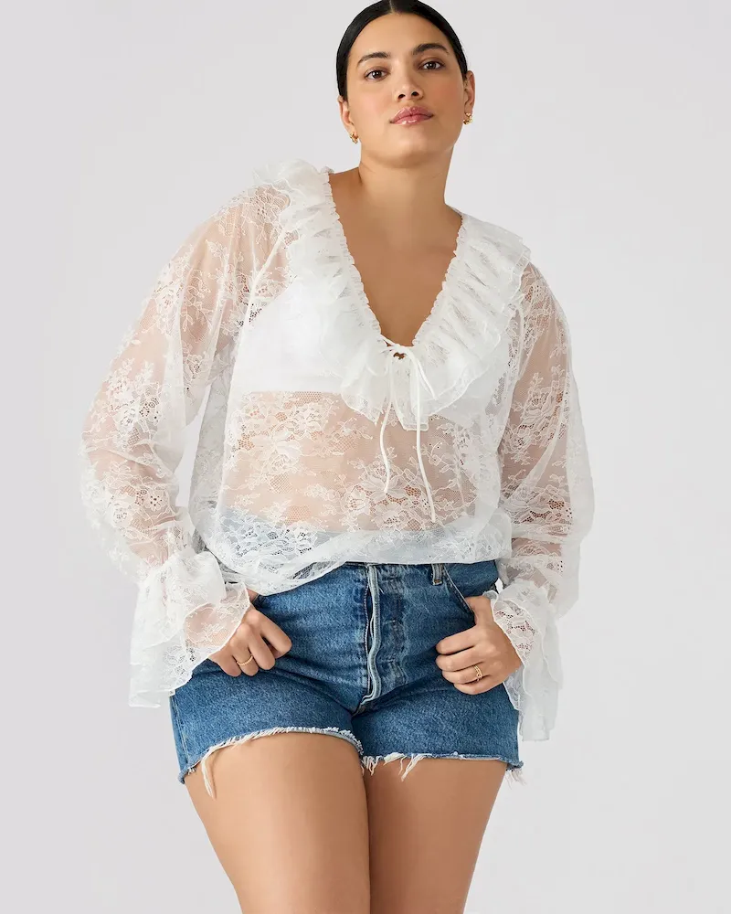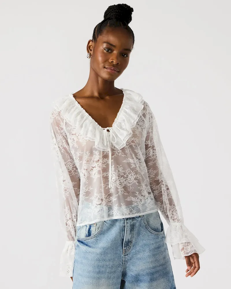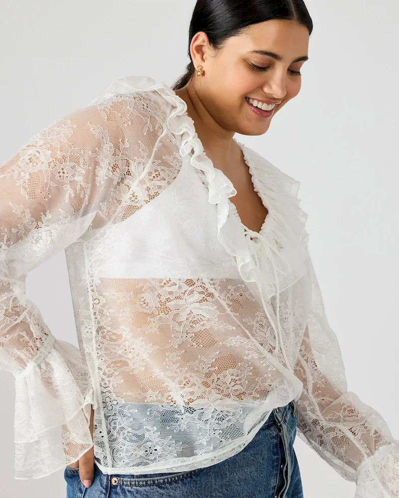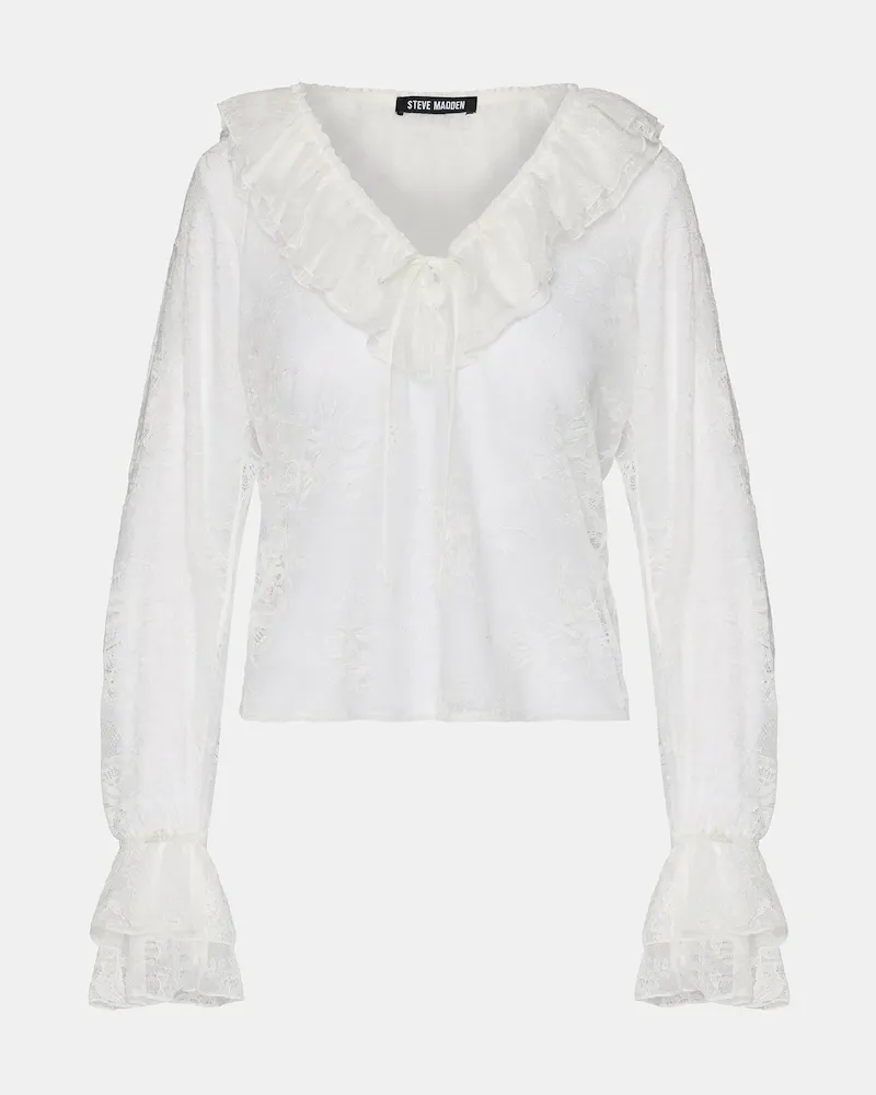Expertly designed with intricate lace detailing, this elegant HAMPTON LACE blouse top is the perfect addition to any wardrobe. With long sleeves and delicate ruffles, it combines feminine charm with timeless style. Perfect for any occasion, this top effortlessly adds a touch of sophistication to any outfit.