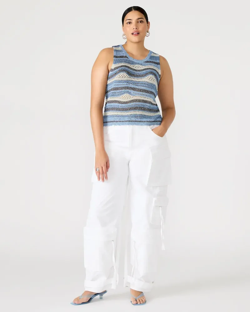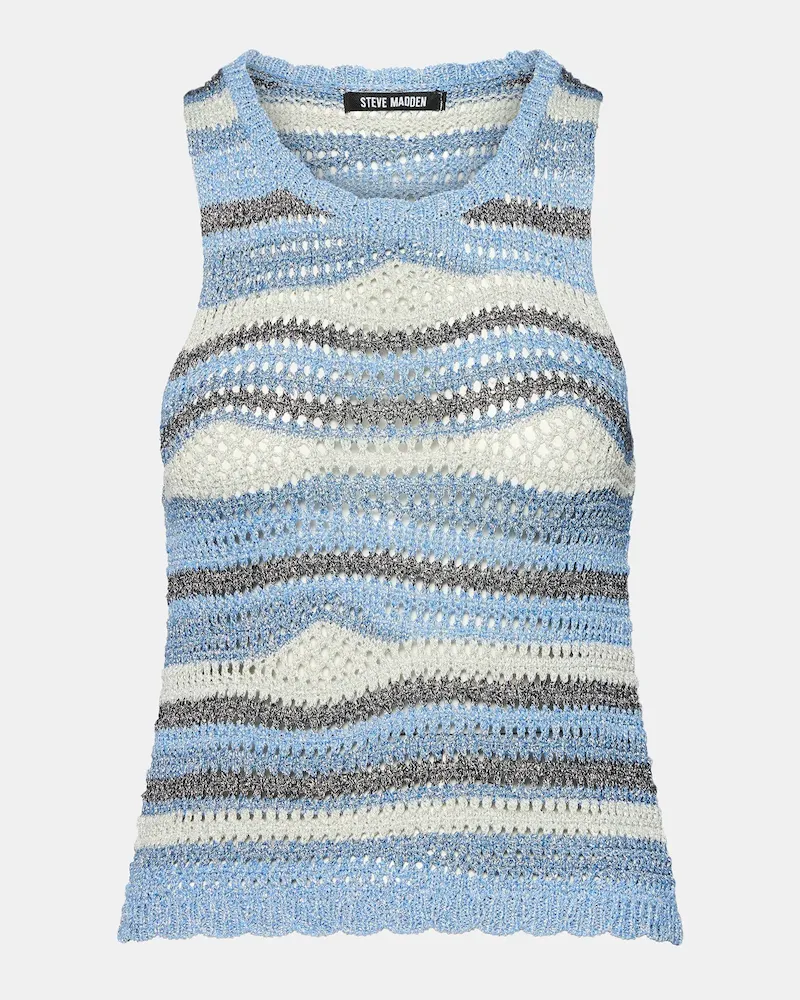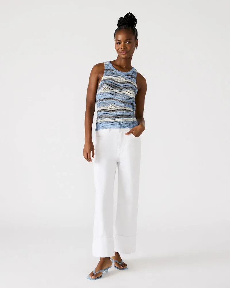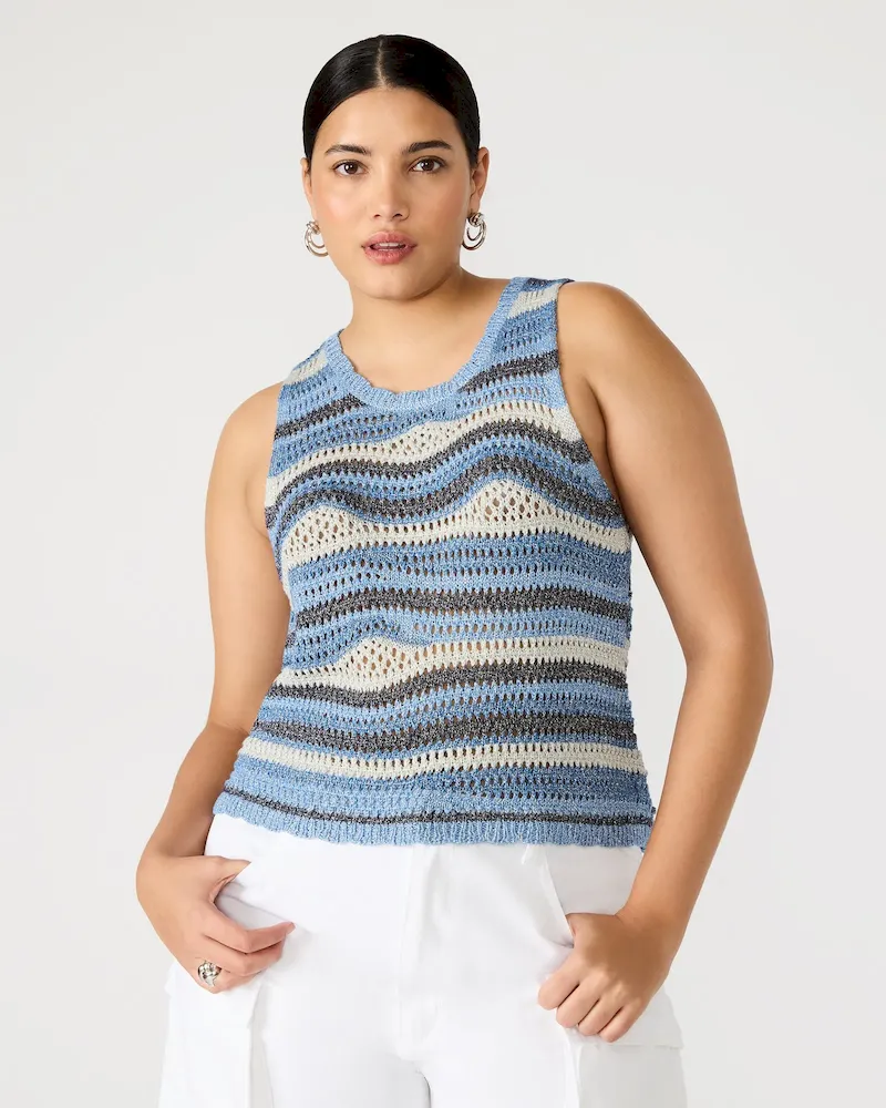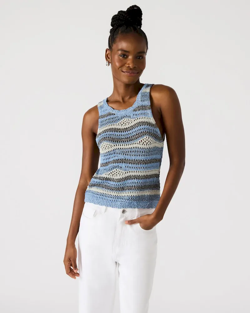 Crafted from a knit crochet fabric, the HANNAH top offers a unique and stylish twist to the classic sweater tank. Lightweight yet comfy, this top is perfect for adding texture and interest to any outfit. Stay on-trend with this versatile piece.