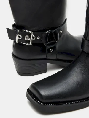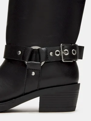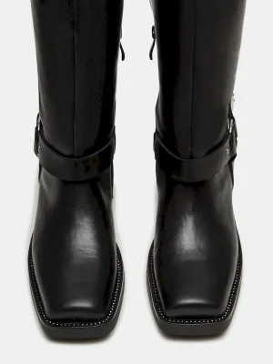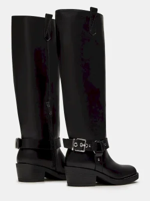 Upgrade your style with these HAWKINS moto boots. Featuring a sleek knee-high design and edgy buckle detail, these boots are the perfect combination of fashion and functionality. The square toe adds a modern touch, making these boots a must-have for any fashion-forward individual.