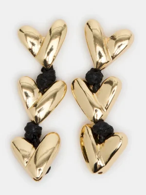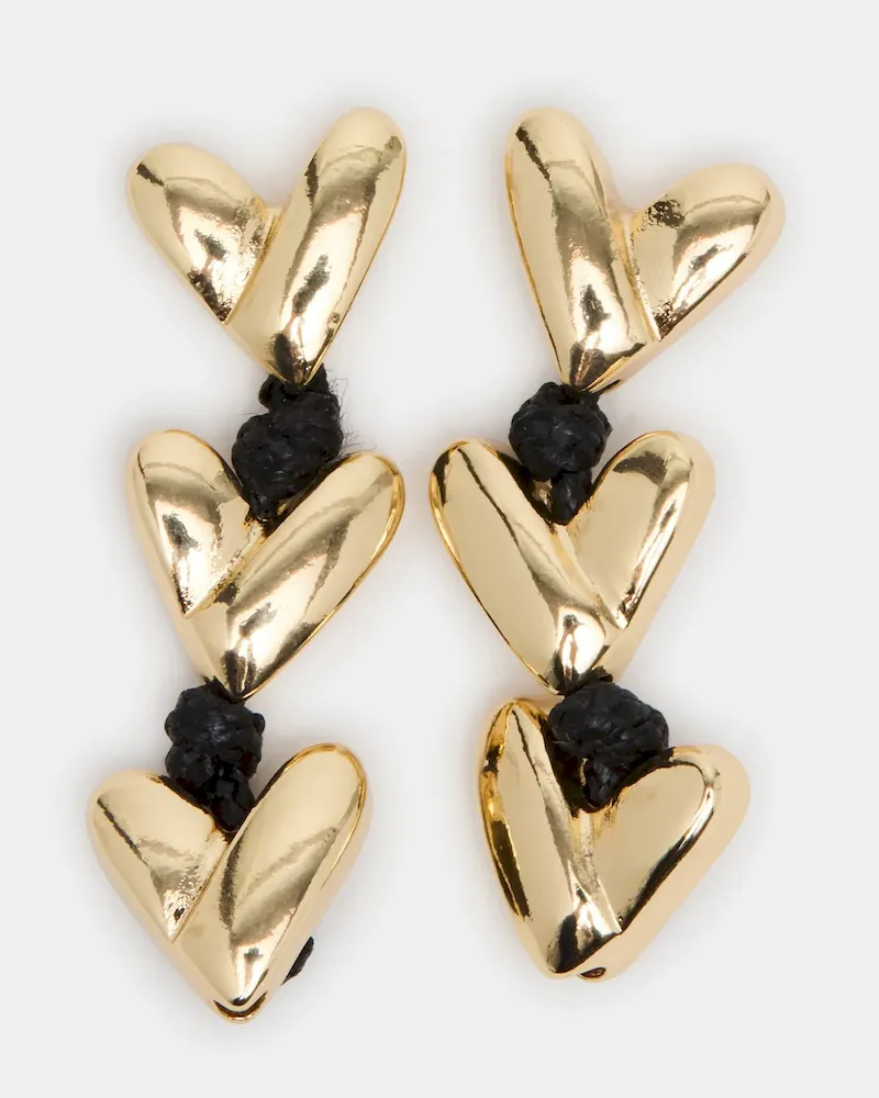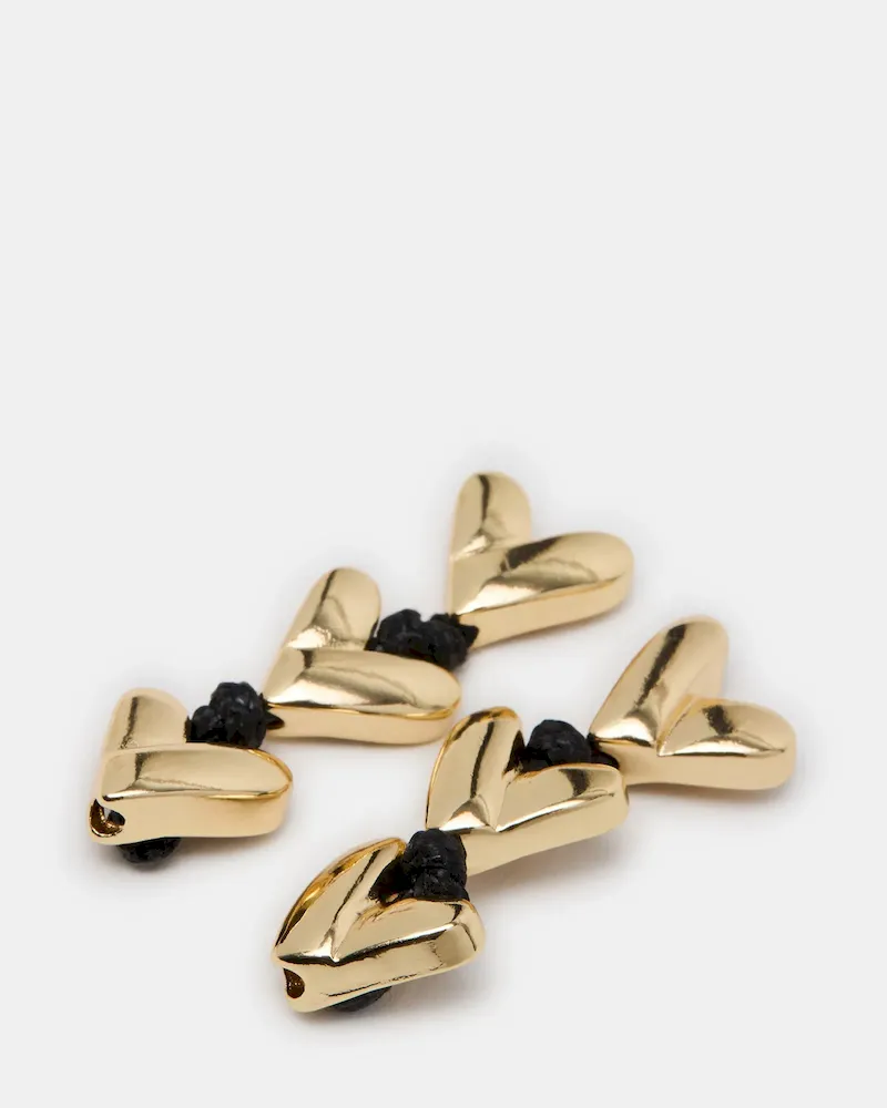 Expertly crafted with a gold finish and detailed with sleek black cord knot details, these HEART LINEAR earrings are both elegant and modern. The linear design adds a touch of sophistication, making them the perfect accessory for any occasion. Enhance your style with these versatile earrings.