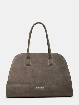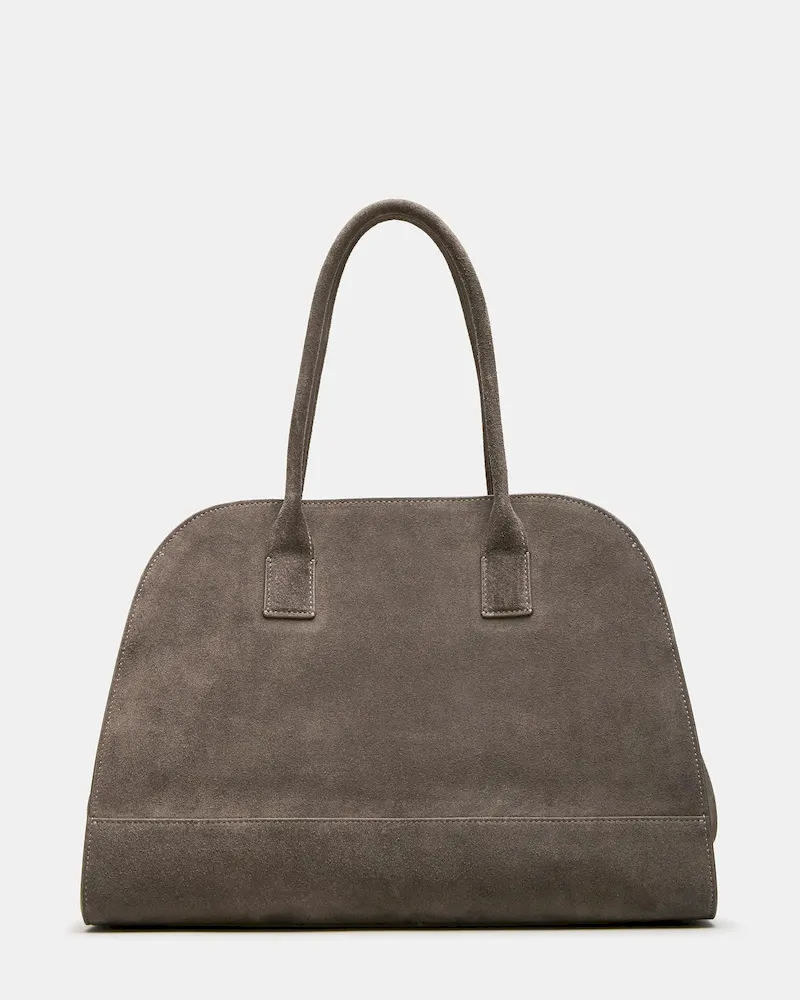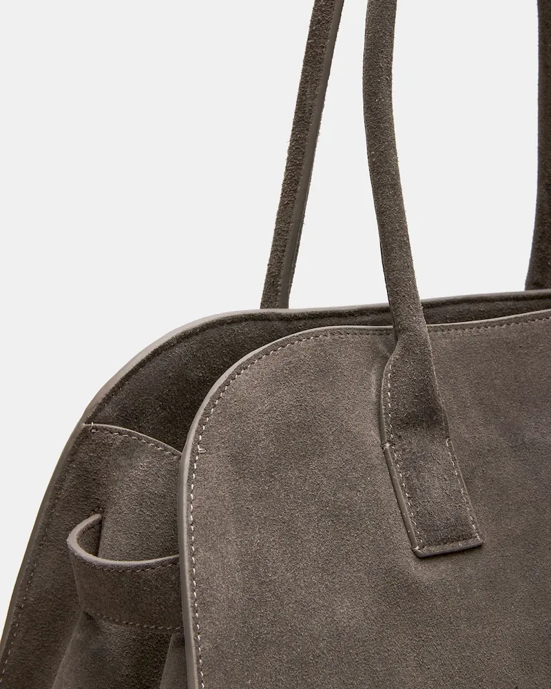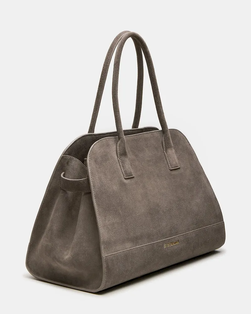 The HEIDEE bag is the ultimate everyday shoulder bag tote. Made with suede materials, it features an inside zip pouch for secure storage, a convenient snap button closure, and stylish buckle detail on the shoulder straps. Stay organized and look fashionable with this must-have accessory.