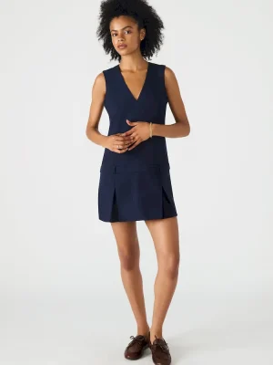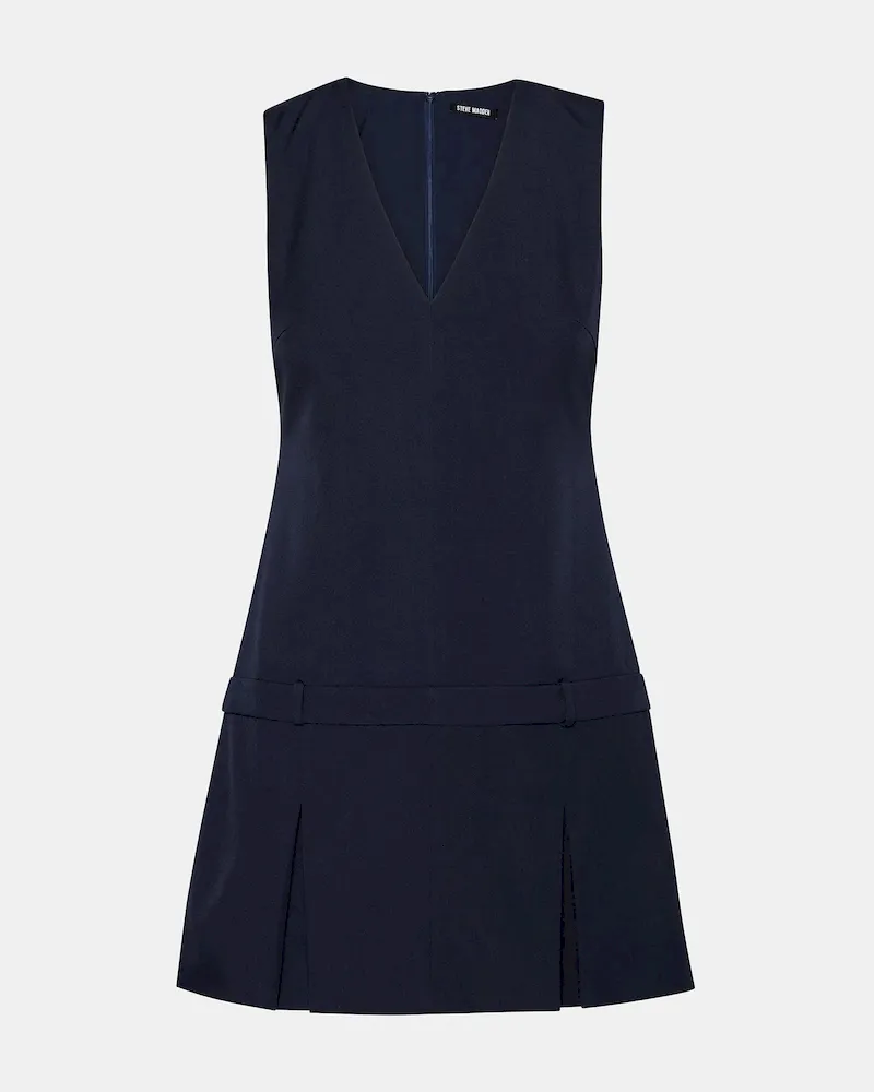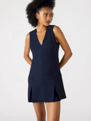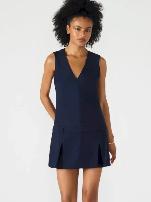 The HENLEY dress features a flattering V-neckline and a playful pleated bottom skirt that adds movement and style. Designed as a mini dress, it includes belt loops for a customizable fit and a back zipper closure for easy wear. This piece combines classic details with modern tailoring, perfect for versatile, polished looks.