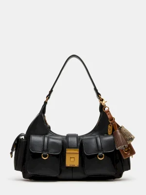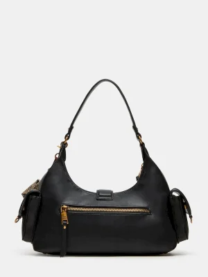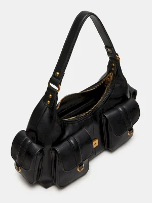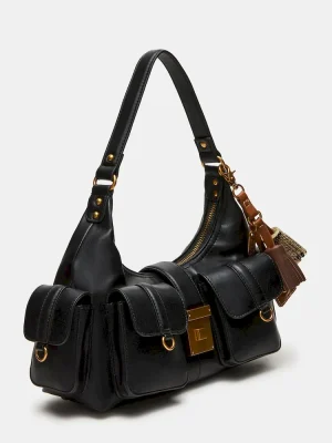 The ISSAC BAG BLACK is a versatile cargo shoulder bag designed for organized, everyday use. Featuring multiple functional pockets, a magnetic snap tab, and secure zipper closures, it offers practical storage solutions. Inside, standard organization compartments keep essentials neatly arranged, while a back zipper adds easy access. The bag is accented with a distinctive tassel horse-bit chain, combining style with utility for a refined, expert look.