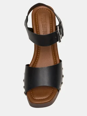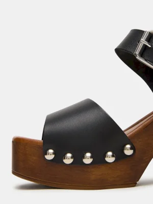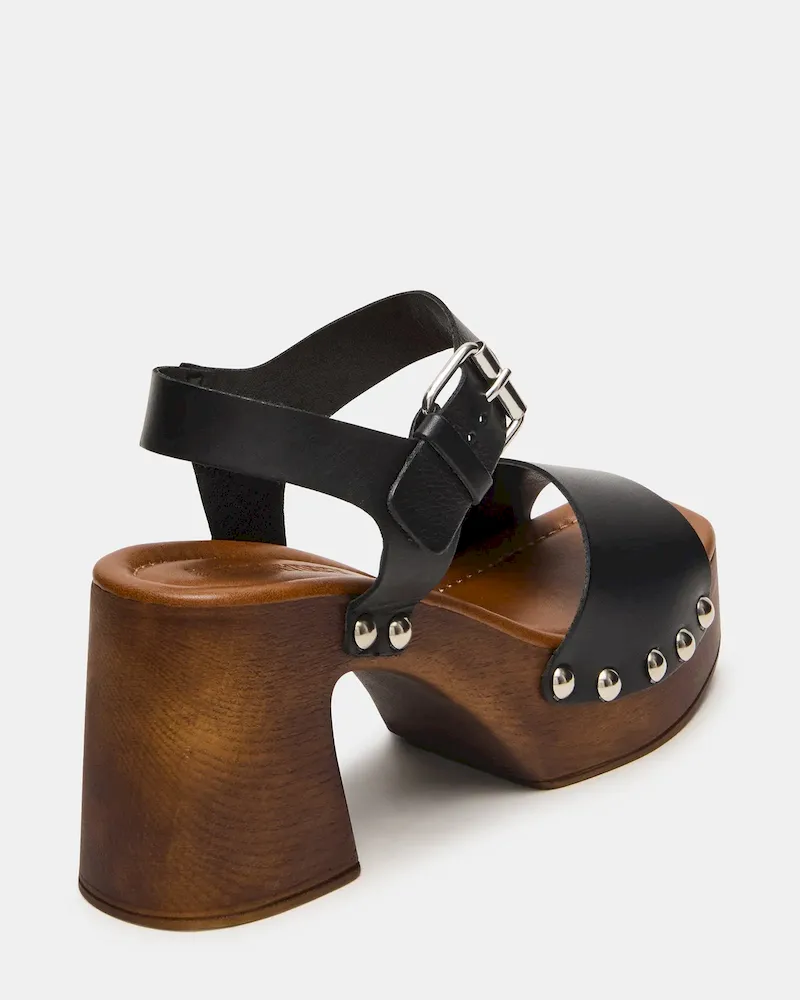 Elevate your style with the JEMMA sandal, featuring a sturdy wood platform and block heel for balanced support. Its square-toe design offers a modern silhouette, while studded detailing adds a refined edge. Perfect for all-day wear, this sandal combines comfort with contemporary sophistication.