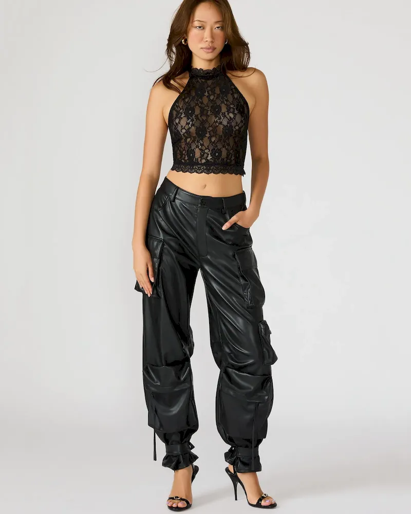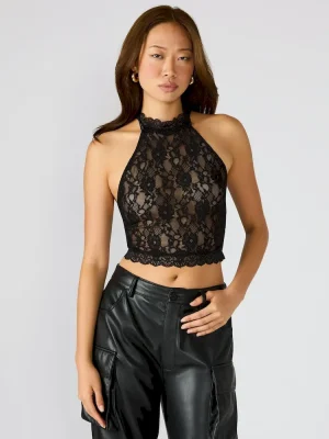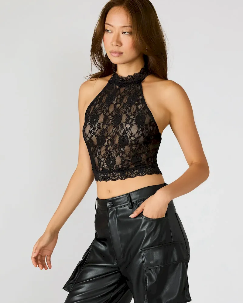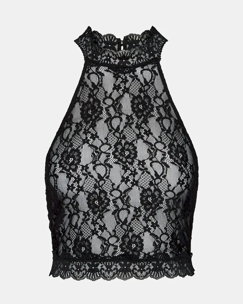 The JUDY TOP BLACK features a lace mesh design with a halter neckline and cropped fit, offering a sophisticated yet edgy style. Crafted from delicate mesh fabric with intricate lace details, this top provides breathability and a refined texture. Its halter cut enhances the shoulders and neckline, making it perfect for layering or wearing solo for a statement look. Ideal for pairing with tailored pants or skirts to elevate evening and casual ensembles.