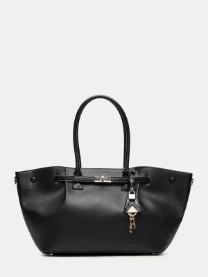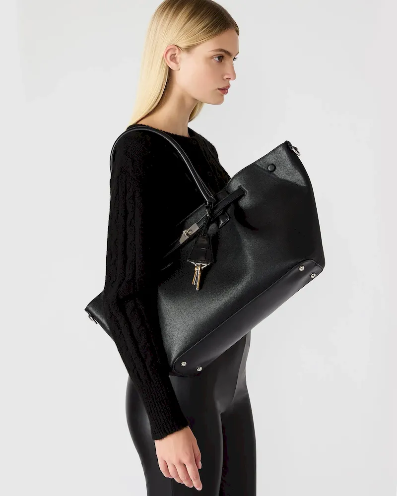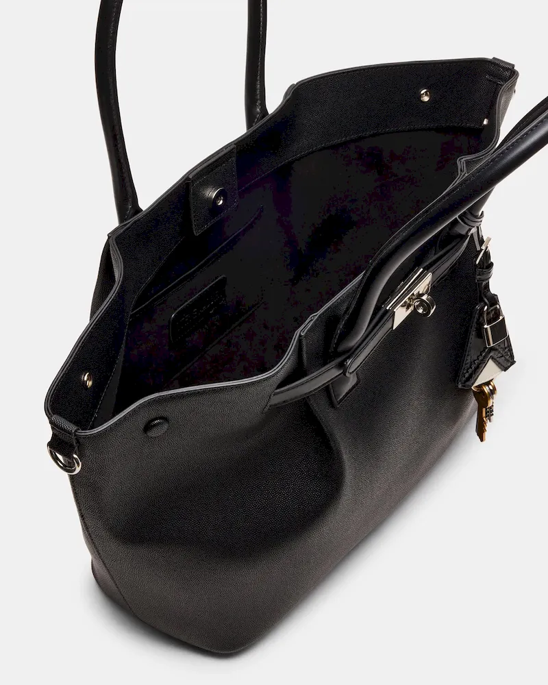 The KACEY BAG BLACK tote bag combines spacious design with sophisticated security features. Crafted for everyday use, this large tote includes elegant padlock and key bag charms that add a refined touch while emphasizing security. Its ample interior accommodates all essentials, making it ideal for both work and leisure, seamlessly blending functionality with style.