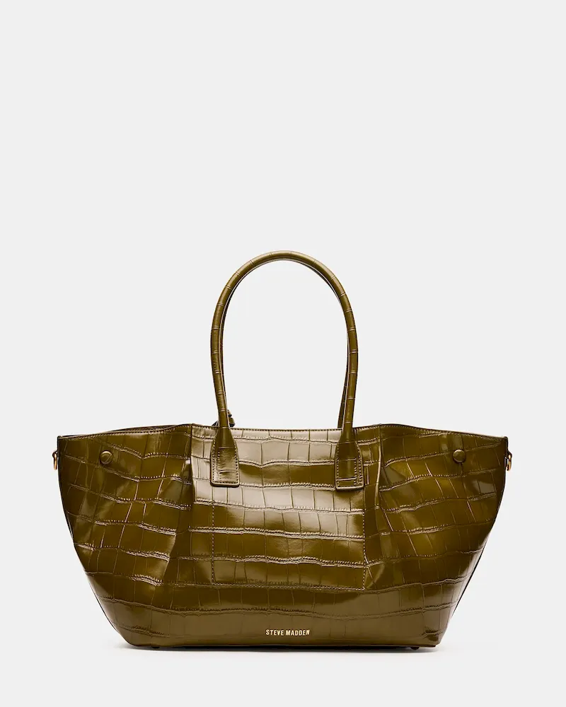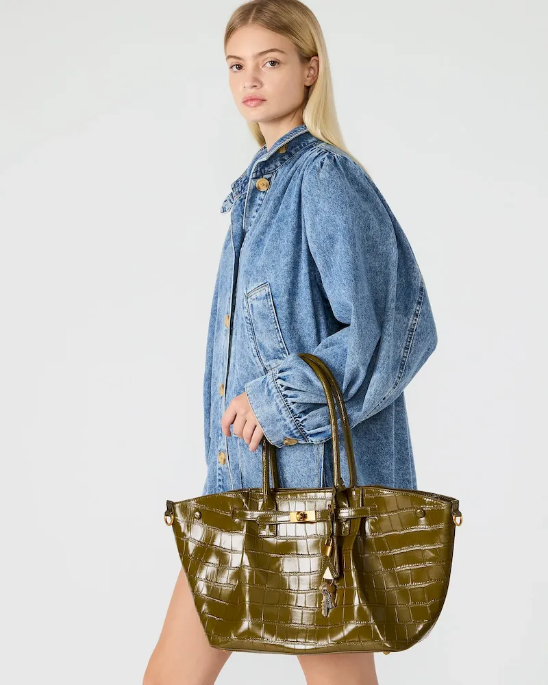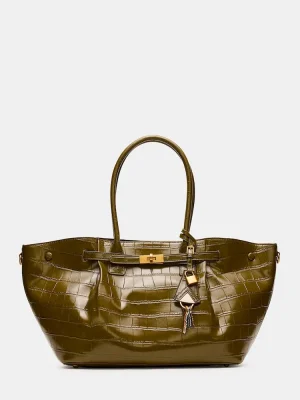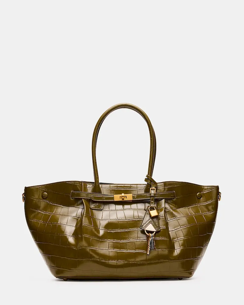 The KACEY BAG OLIVE tote combines spacious design with sophisticated security features. Crafted for everyday use, this large tote includes elegant padlock and key bag charms that add a refined touch while emphasizing security. Its ample interior accommodates all essentials, making it ideal for both work and leisure, seamlessly blending functionality with style.