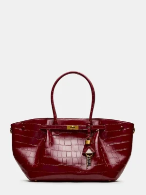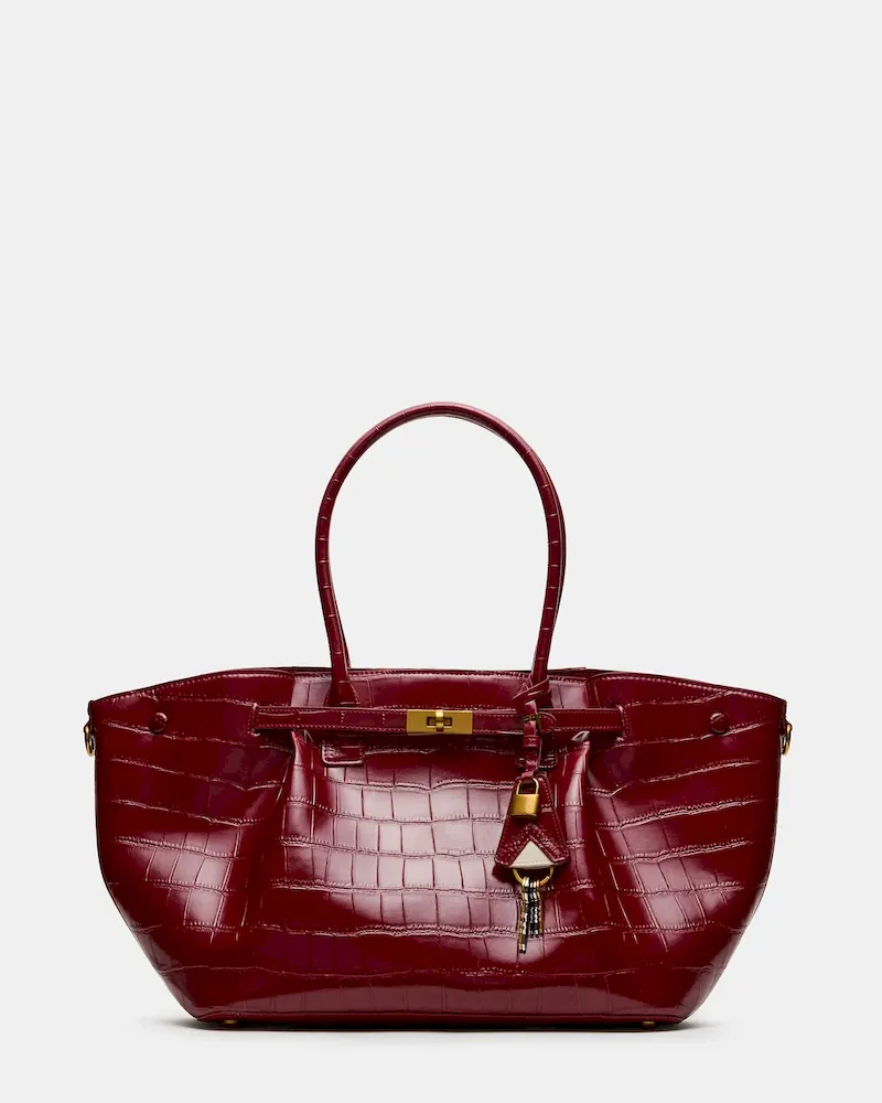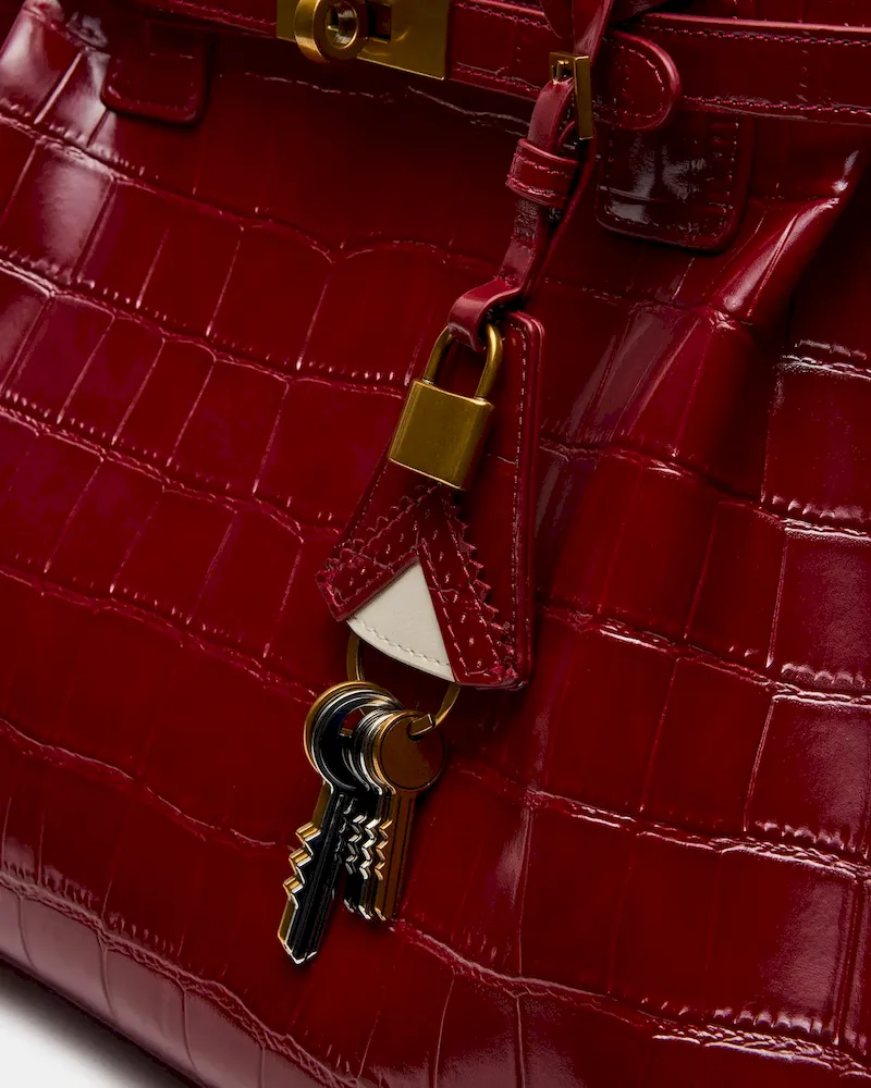 The KACEY BAG RED tote combines spacious design with sophisticated security features. Crafted for everyday use, this large tote includes elegant padlock and key bag charms that add a refined touch while emphasizing security. Its ample interior accommodates all essentials, making it ideal for both work and leisure, seamlessly blending functionality with style.