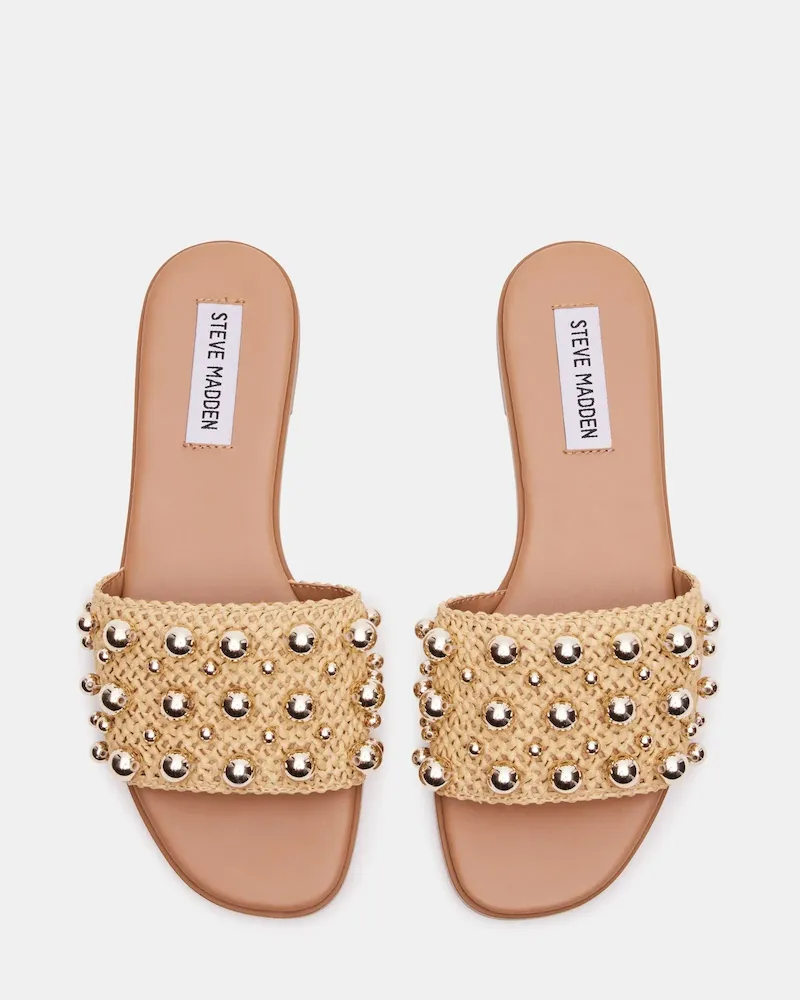 Meet the KEELY sandal – perfect for those sunny days! Slide into these raffia sandals and let the studded details add a touch of style to your look.
