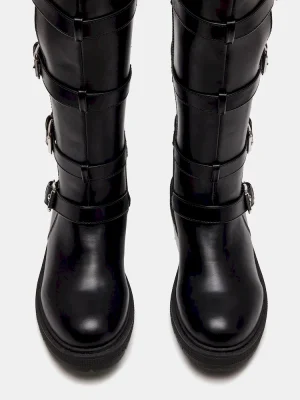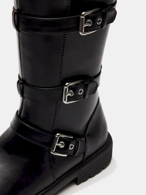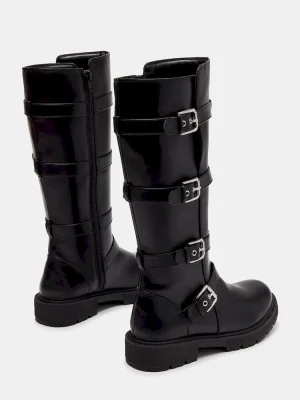 Buckle hardware fastens down the side of the BROOKEE kids’ engineer boot, a knee-height design with a lug sole for a secure and comfortable step.