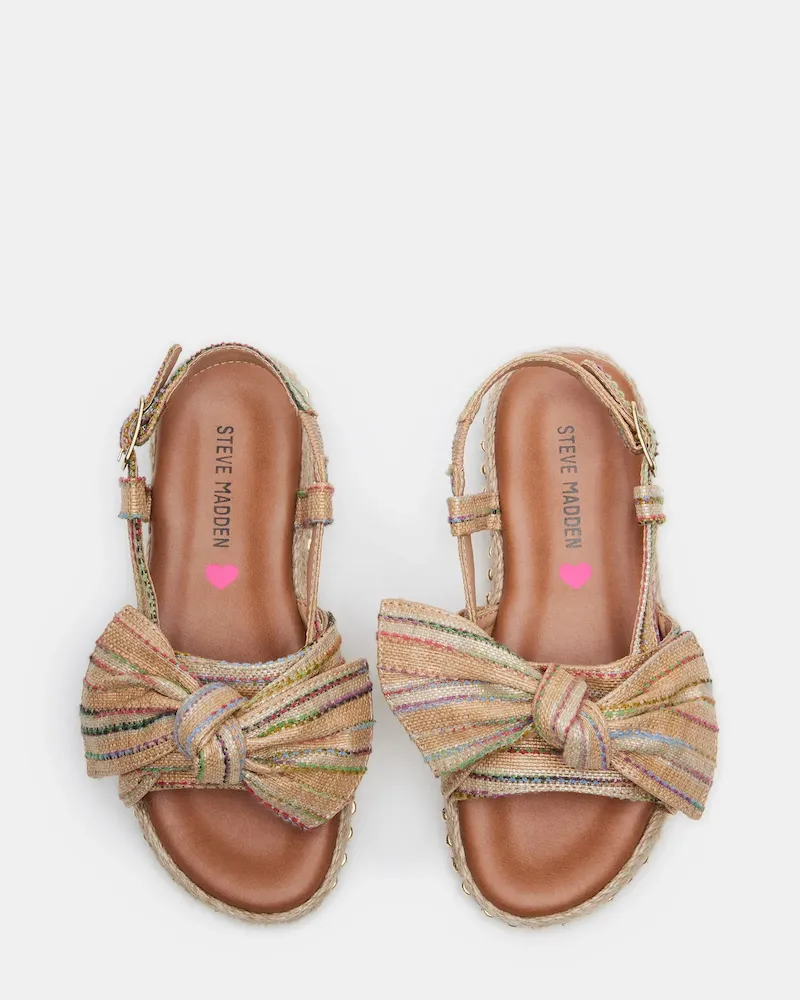 The JOLADIE is a stylish platform espadrille kids’ sandal with a charming bow detail. This sandal provides extra height and support for active kids while adding a touch of elegance to any outfit. Made with natural materials, it is unique and comfortable for young feet.