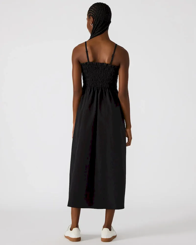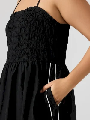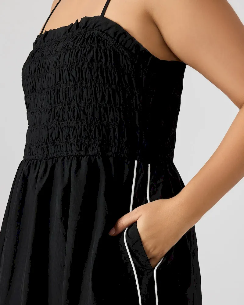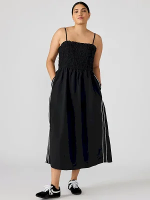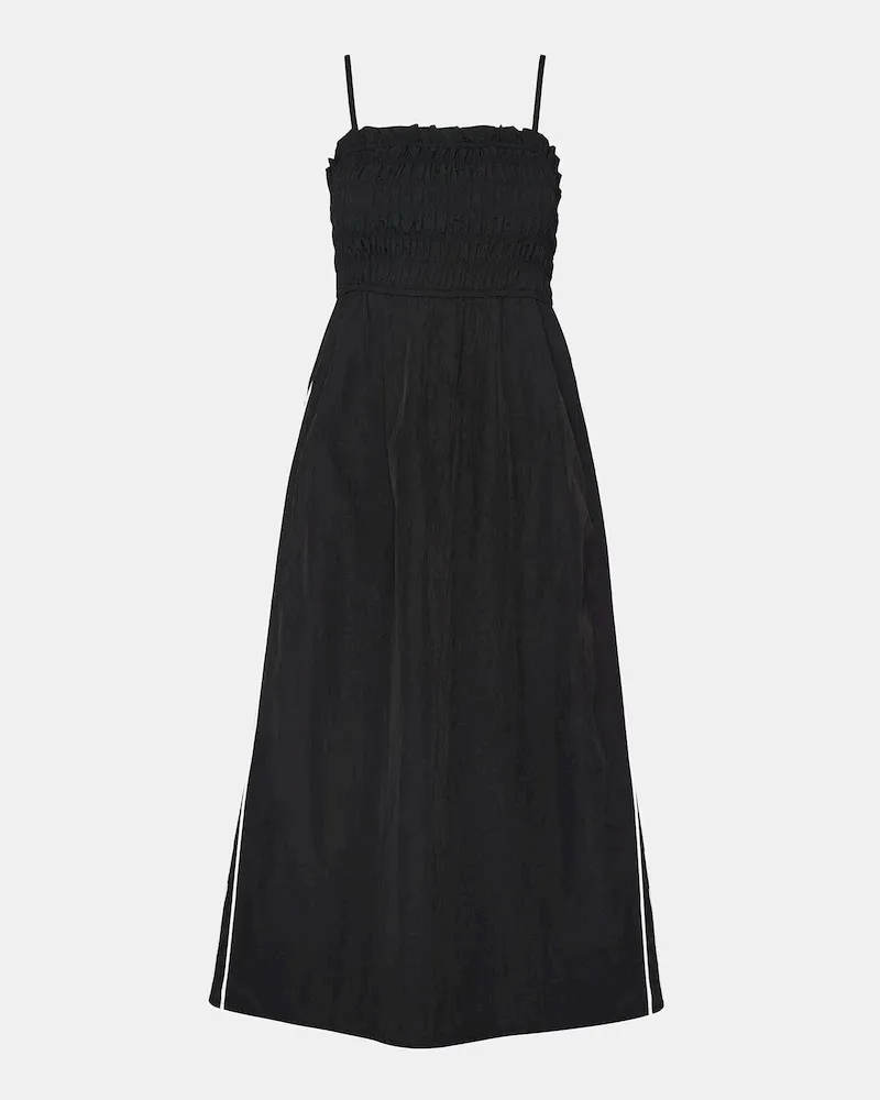 Expertly designed for comfort and style, the KIT dress is the perfect addition to your wardrobe. The flowy maxi dress features sleek stripe detailing, while the pull-on style and adjustable straps provide a customizable fit. The smocked top adds a touch of flair and versatility to this must-have piece.