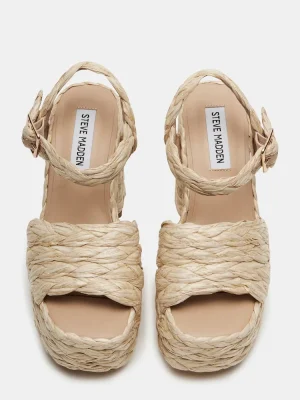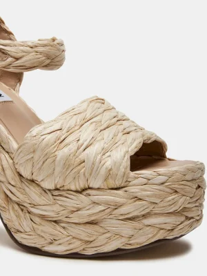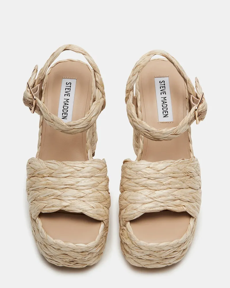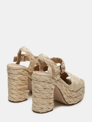 Elevate your style with KORAL platform heels. The raffia material adds a touch of luxury while the block heel provides stability and comfort. The open-toe design is perfect for summer.