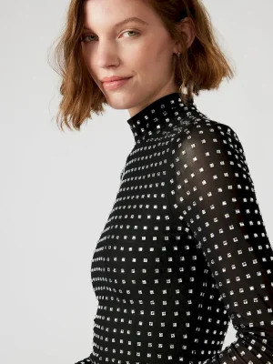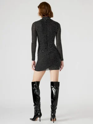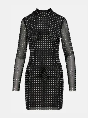 Elevate your style with our KRISTA dress. This long-sleeved mini dress features a mock neck and back zipper closure. This stunning dress also features unique square-shaped rhinestone stud embellishments for a touch of glamour. Make a statement with this elegant and sophisticated piece, perfect for any occasion.