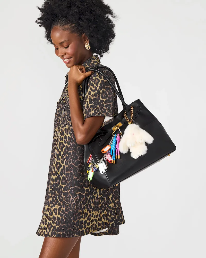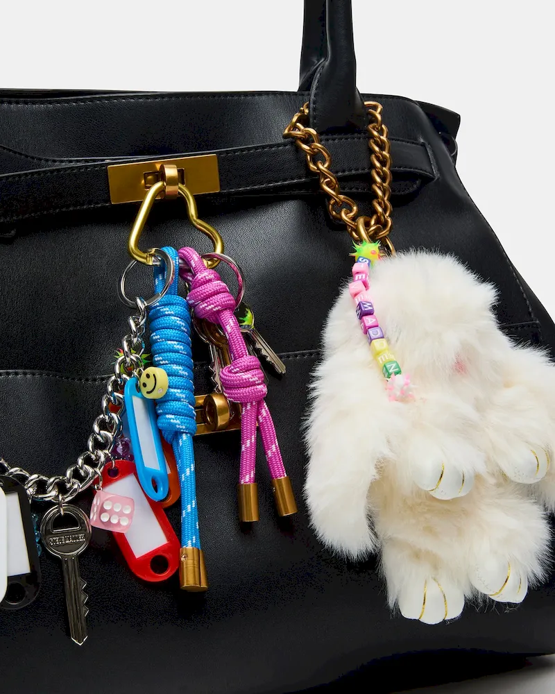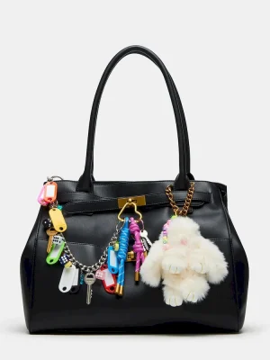 Introducing the LEILANI bag- a must-have handbag for any fashion-forward individual. This large tote features a detachable bunny bag charm and a playful multi-colored logo. The detachable swag chain adds a touch of versatility, while the adorable smiley face charm brings a pop of personality. Elevate your style with this statement piece.
