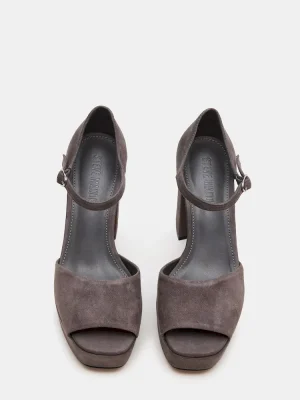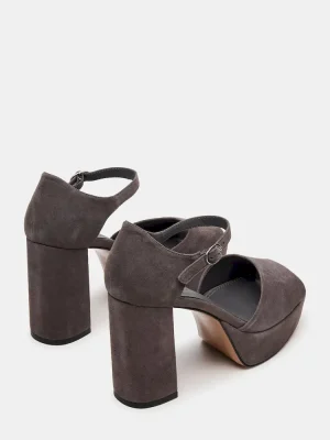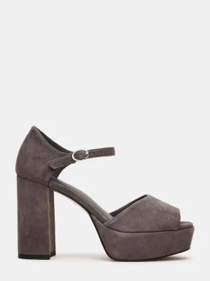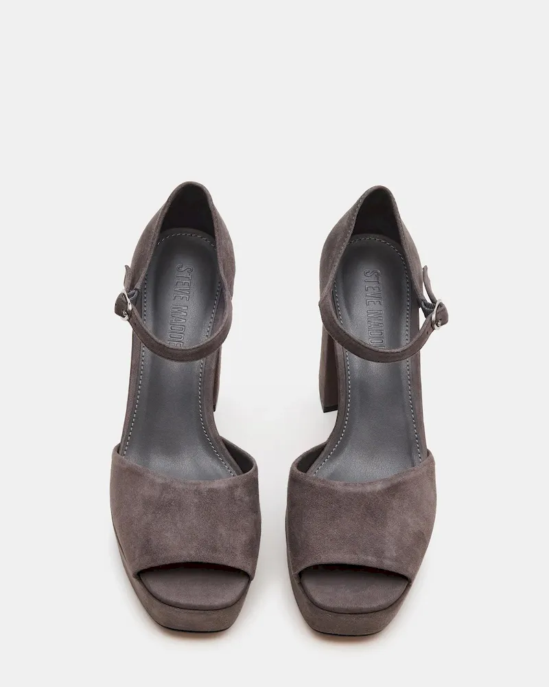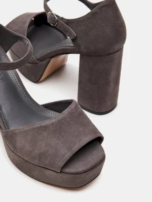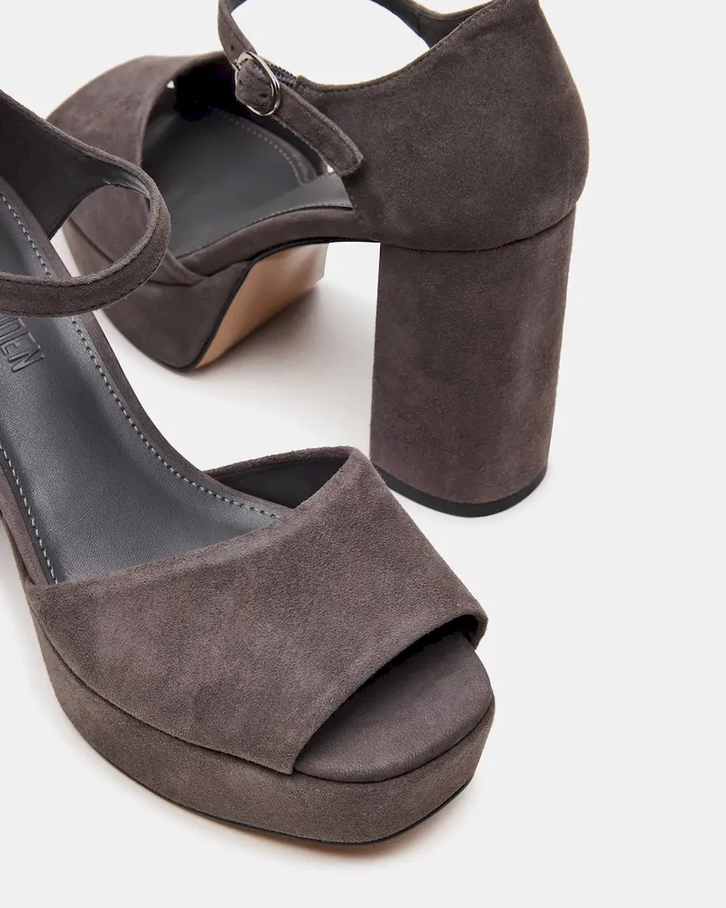 The LONDON GREY SUEDE features a sturdy platform paired with a block heel for enhanced stability and comfort. Its secure ankle strap ensures a confident fit, making these heels a sophisticated choice for all-day wear. Crafted with attention to detail, they combine style and practicality seamlessly.