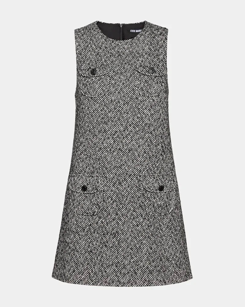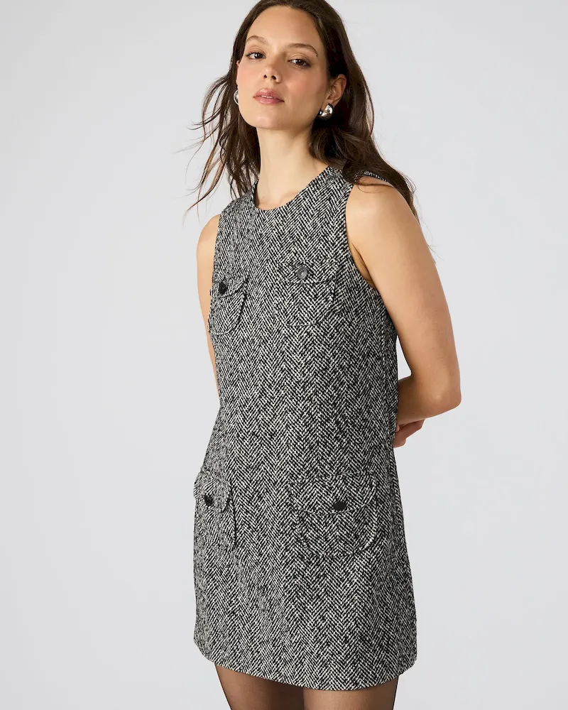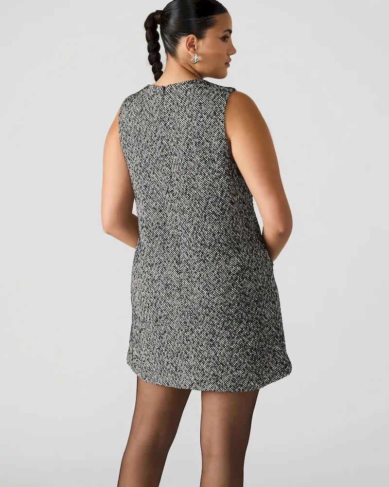 This sleeveless mini dress features a classic tweed design, offering a sophisticated yet modern look. Its tailored silhouette is enhanced by faux pockets, adding style without bulk. Perfect for elevating your wardrobe with a chic, versatile piece that transitions seamlessly from day to night.