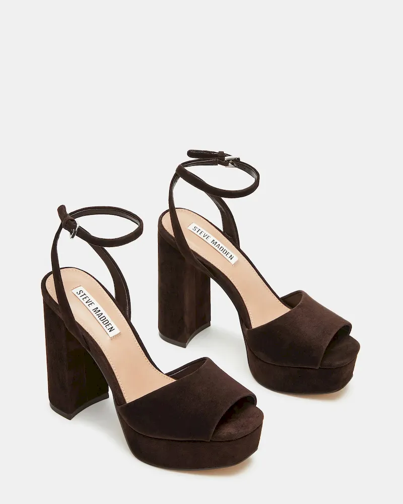 The LOURDES sandal secures a chunky block heel and front platform with delicate straps in a dressy suede look.