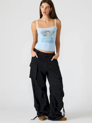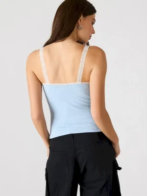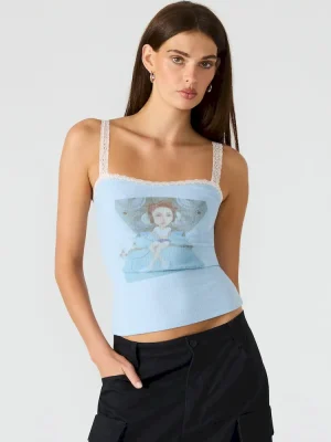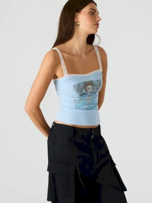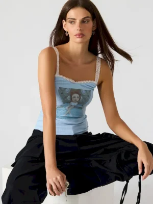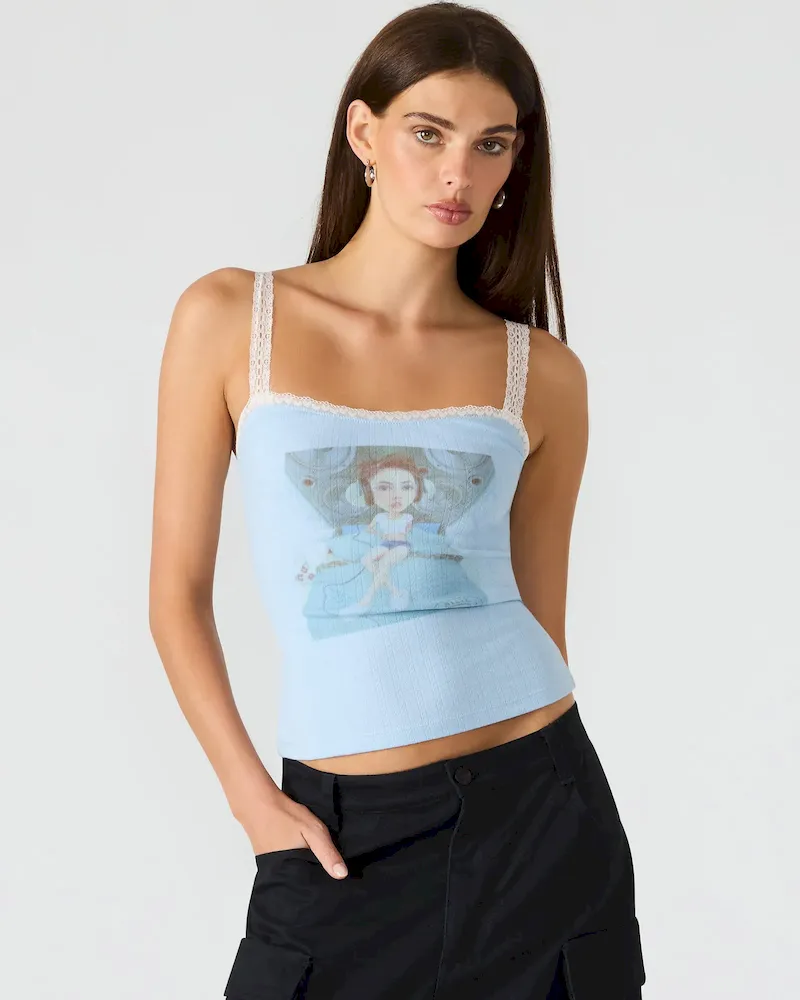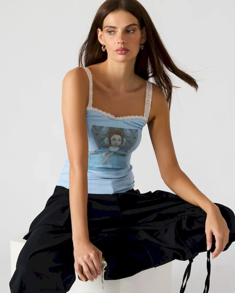 The LOVE GOLDIE TANK SURF BLUE top features delicate lace trim straps for a refined, feminine touch paired with a distinctive graphic design that sets it apart. Crafted for a comfortable fit, this tank top blends style and individuality, making it a versatile choice for casual or elevated warm-weather looks.
