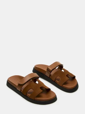 The MAYVEN slides feature comfy construction details like a molded footbed, a treaded flatform sole, and an adjustable top strap, plus a front strap with a geometric cutout design.