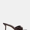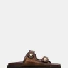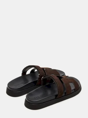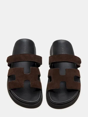 The MAYVEN CHOCOLATE BROWN SUEDE slides feature comfy construction details like a molded footbed, a treaded flatform sole, and an adjustable top strap, plus a front strap with a geometric cutout design.