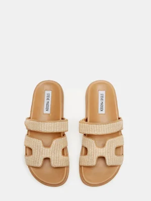 The MAYVEN slides feature comfy construction details like a molded footbed, a treaded flatform sole, and an adjustable top strap, plus a front strap with a geometric cutout design.