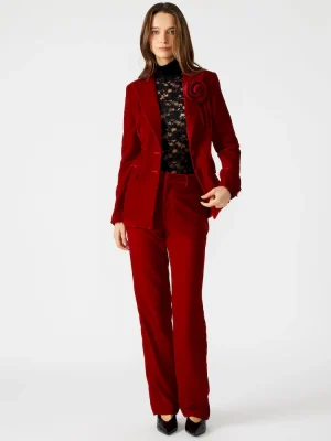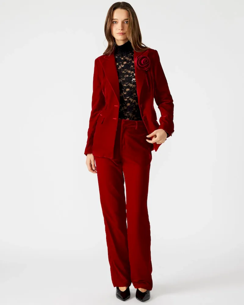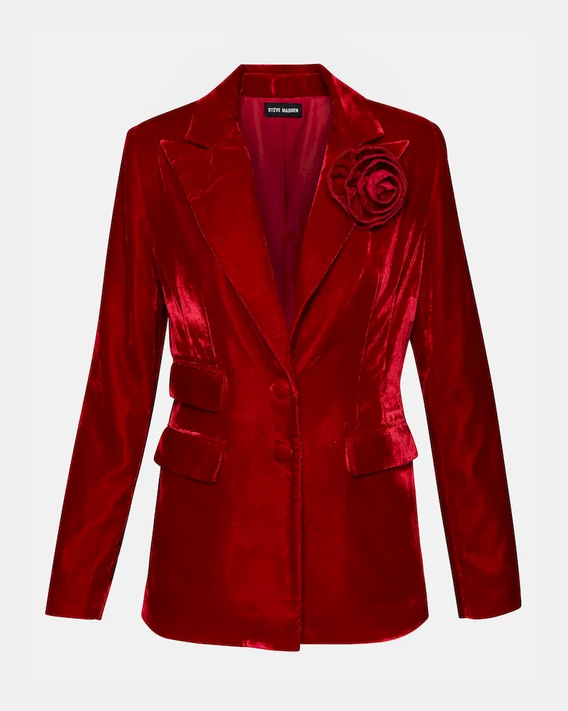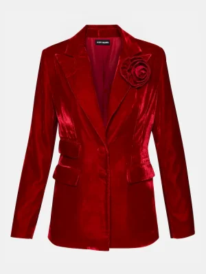 This elegant MERENE blazer features a button-up closure, long-sleeves, and two functional front pockets, making it both stylish and functional. The rose decal and velvet material adds a touch of sophistication, making it the perfect statement piece for any professional or formal event.