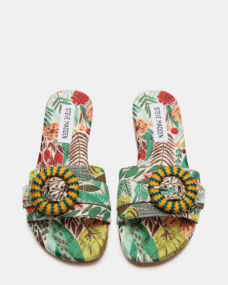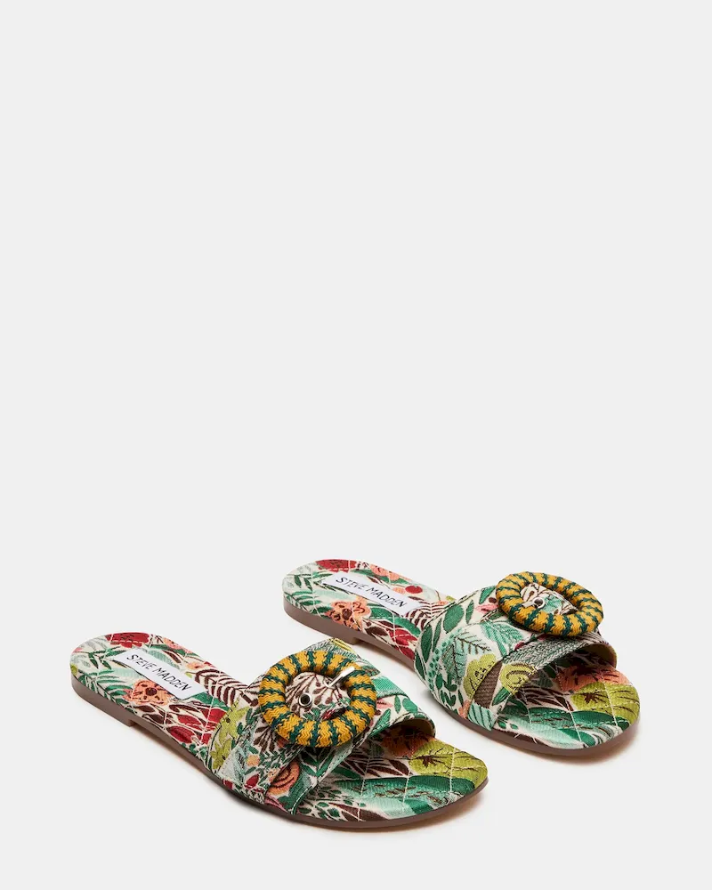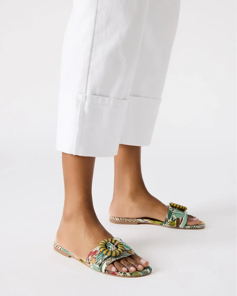 The MERLA flat slide sandal is designed for both style and comfort. The decal on the strap adds a touch of elegance to your step. Perfect for any occasion, these sandals offer the perfect balance of fashion and functionality.
