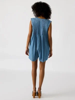 The MICK sleeveless denim romper features a comfortable pull-on design with a stylish front tie, combining ease of wear with a flattering silhouette. Crafted for versatility, it offers a modern, casual look perfect for warm weather or layering.