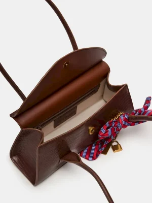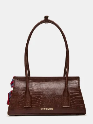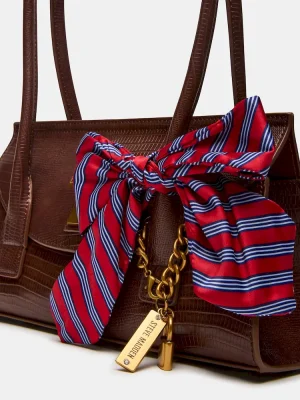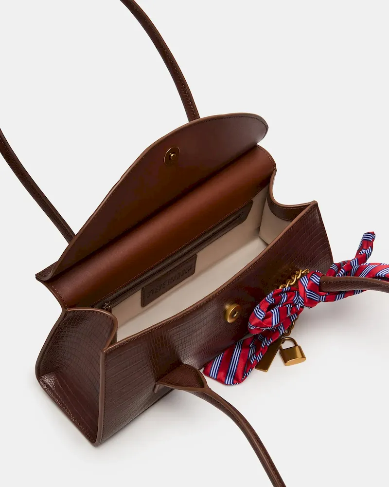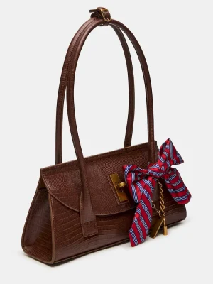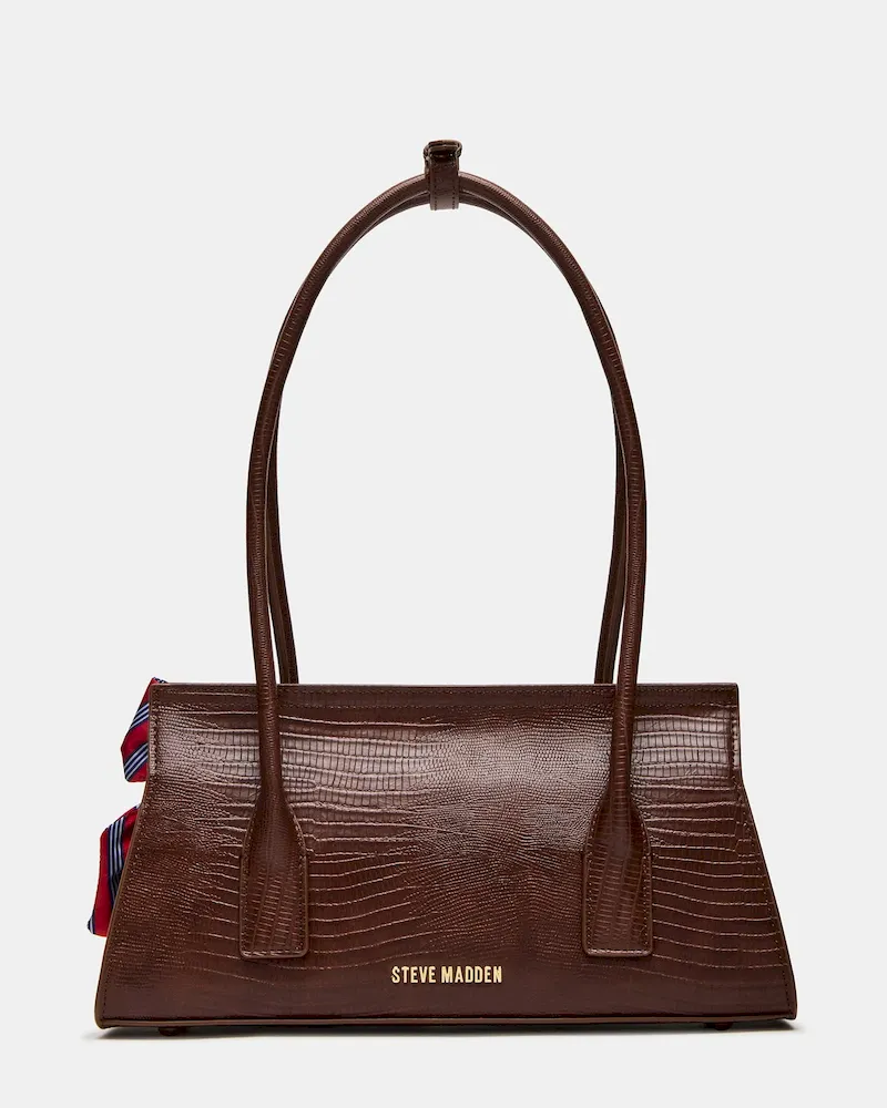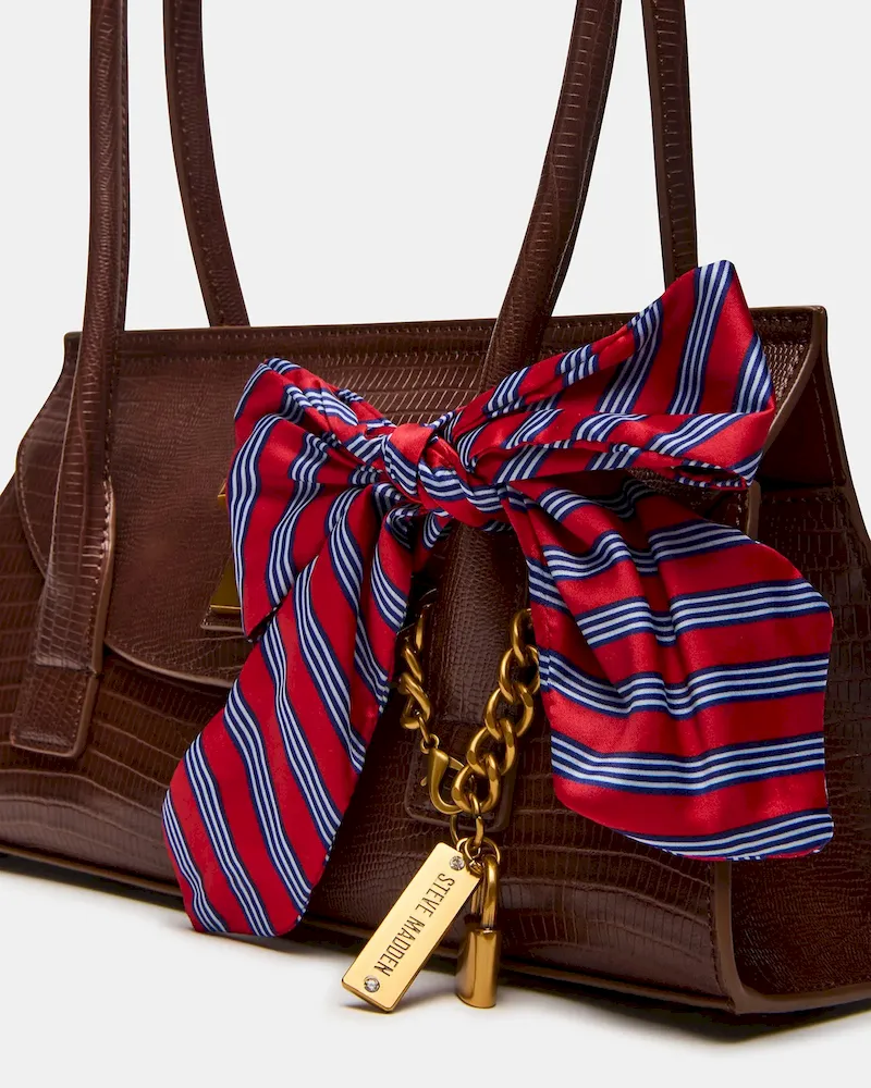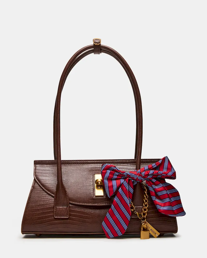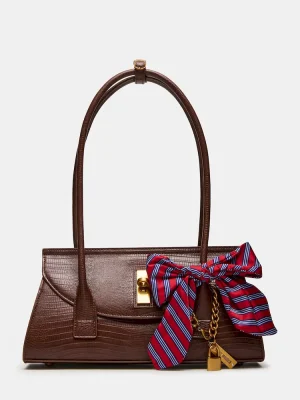 The MILAN BAG CHOCOLATE blends classic menswear-inspired design with modern functionality. This structured, elongated shoulder strap bag features a refined preppy aesthetic, accented by a distinctive bow tie charm paired with a padlock charm for subtle sophistication. Its secure mag snap closure and back zipper interior provide organized storage, making it both stylish and practical for daily use.