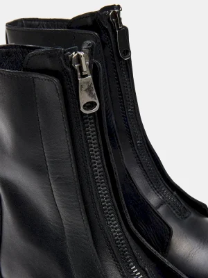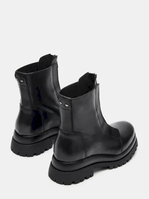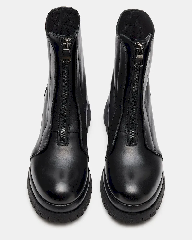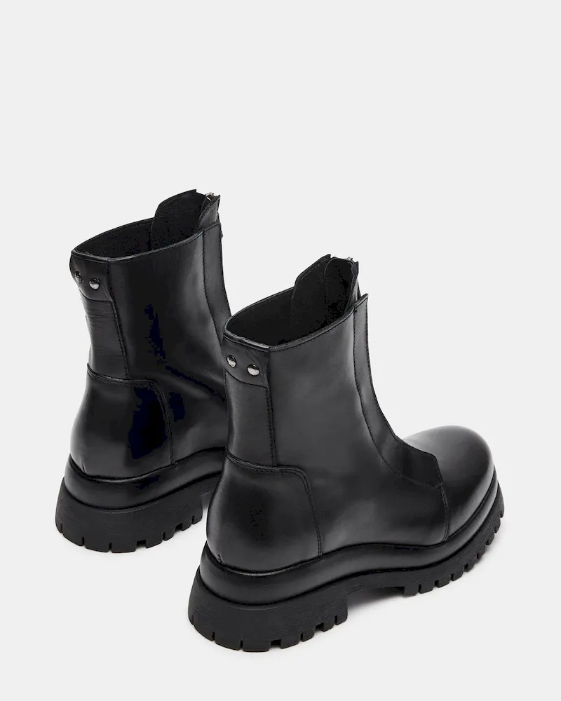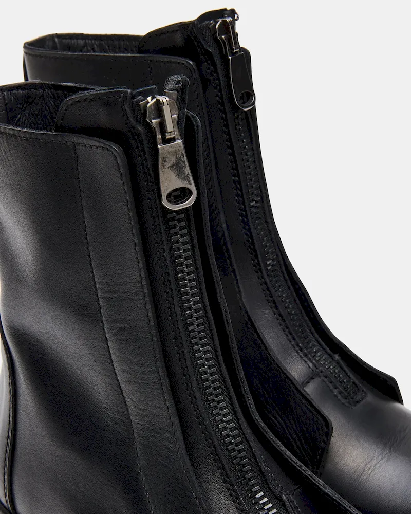 The MILTON BLACK LEATHER ankle boot delivers a sleek moto-inspired design with durable leather construction. This bootie combines rugged aesthetics with refined craftsmanship, offering both style and lasting comfort. Its sturdy sole ensures reliable traction, making it an ideal choice for those seeking an edgy yet practical footwear option.