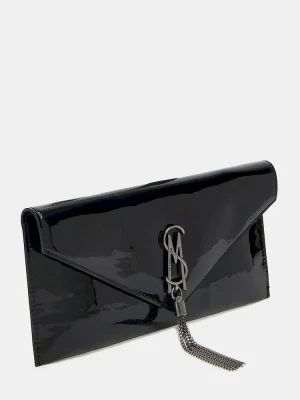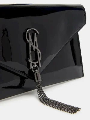 Expertly crafted in sleek black patent, the MORGANA bag offers both style and functionality. With its envelope design and magnetic snap closure, this clutch handbag is perfect for a night out. The interior includes a zipper wall and has enough room to fit a large phone. Finished with a chain tassel featuring the logo, it’s a must-have accessory.