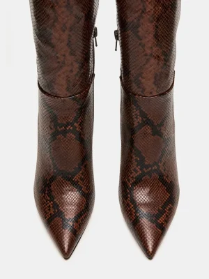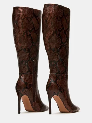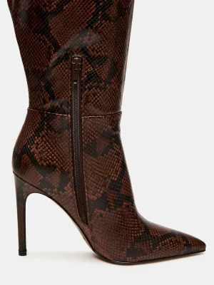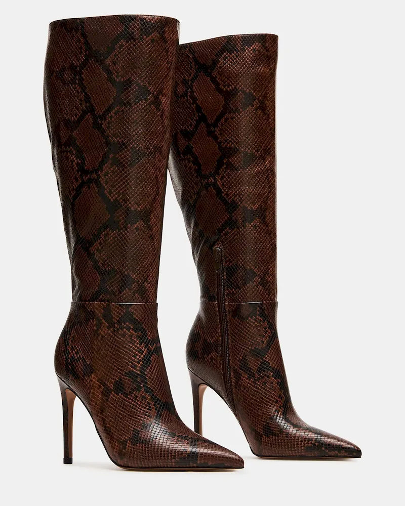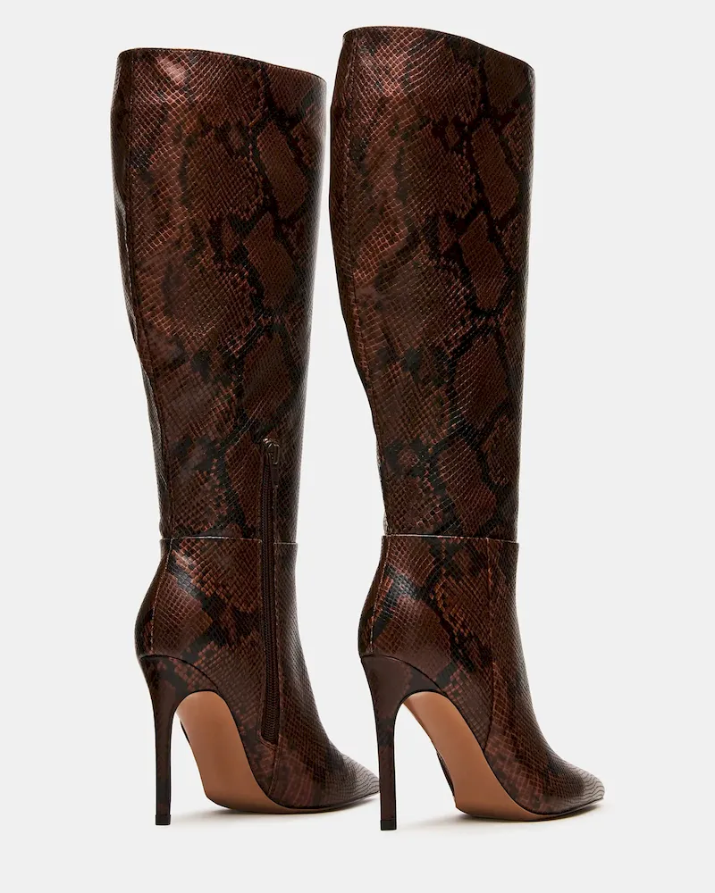 The NITRO BROWN SNAKE WIDE CALF is a sophisticated and versatile addition to any wardrobe. This pointed-toe heeled stiletto boot is designed for both style and comfort, ensuring a confident stride. With a knee-high height, it adds a touch of elegance to any outfit.