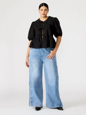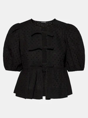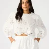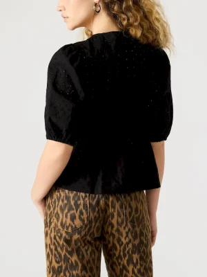 The PAULA top features stylish short-sleeved puff sleeves and a tie-front detail, accented by delicate eyelet detailing. This top offers a chic, modern look perfect for any occasion.