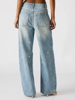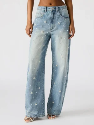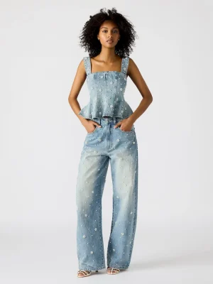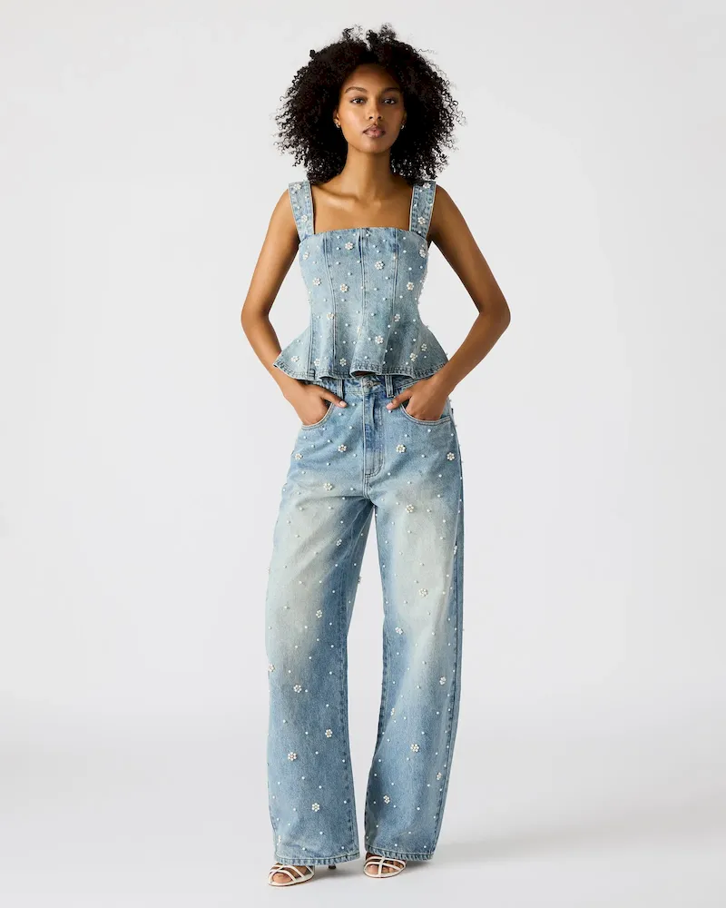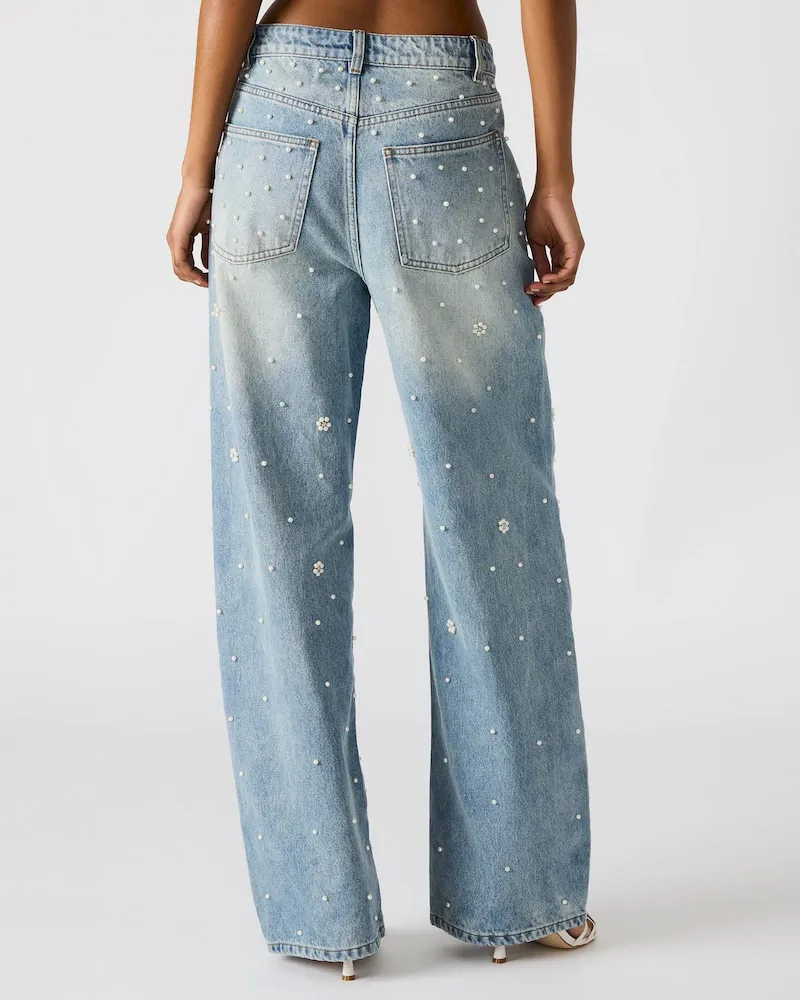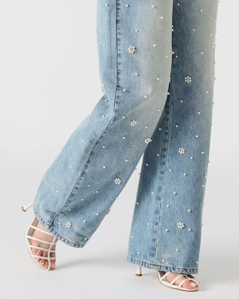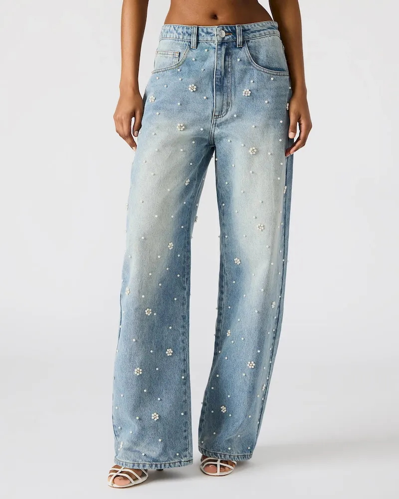 As a wide-leg jean, PERLEI jean offers a sophisticated and comfortable fit. Its functional front and back pockets provide practicality while the zipper and button closure ensure secure wear. With delicate pearl and flower embellishments, it’s the perfect complement to its matching set.