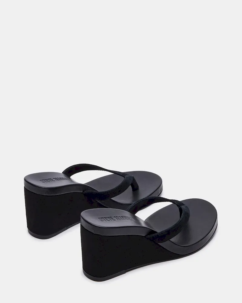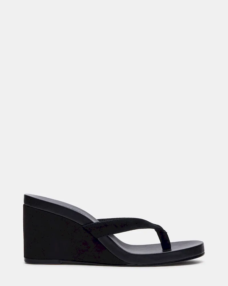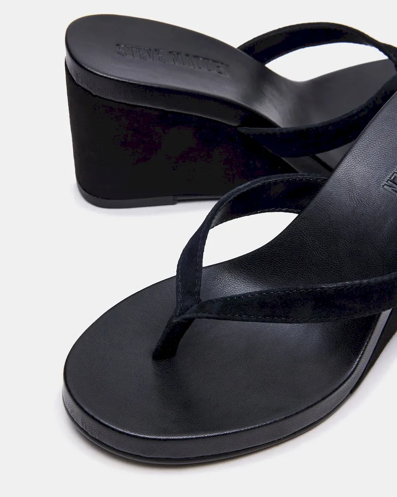 Elevate your summer wardrobe with the PLAYING wedge sandal. Featuring a sleek thong design and a comfortable rounded toe, this mule-style sandal offers both style and ease. The wedge provides subtle lift and stability, making it perfect for all-day wear. This sandal combines sophistication with versatility for effortless pairing with casual or dressy outfits.