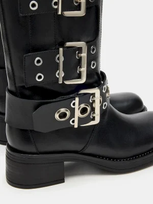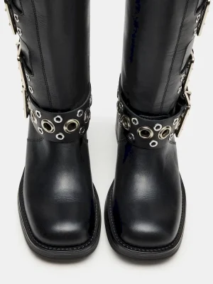 The RAMPAGE boot features a striking square-toe design enhanced with bold grommet details and a secure buckle, embodying the essence of moto-inspired footwear. Expertly crafted for both style and durability, this boot offers a contemporary edge while ensuring lasting comfort and wearability. Ideal for those who appreciate refined, statement-making boots.