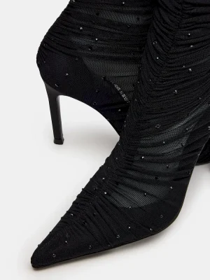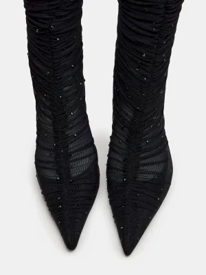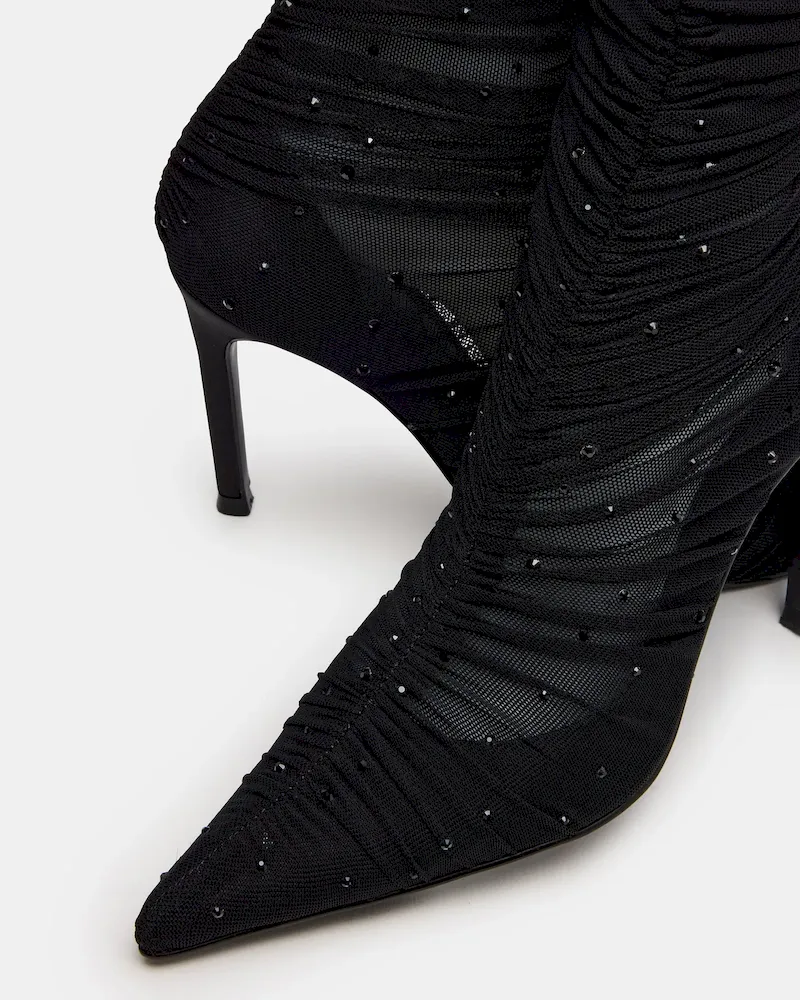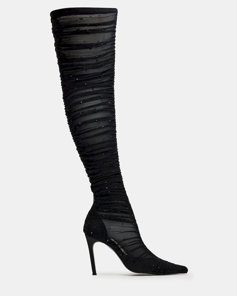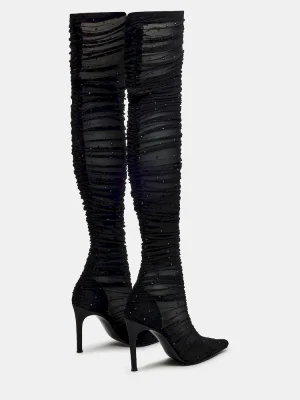 Elevate your style with the RASHIDA BLACK MESH boot, featuring a sleek pointed toe and an over-the-knee silhouette crafted from breathable mesh. The slender stiletto heel adds height and sophistication, making this boot a perfect choice for a refined, fashion-forward look. Ideal for pairing with both dresses and tailored pieces, it combines daring design with expert craftsmanship.